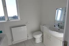 BATHROOM; White suite comprising, bath with electric shower over, W.C. wash hand basin with vanity unit under, rear aspect double glazed window, radiator, tiled floor.