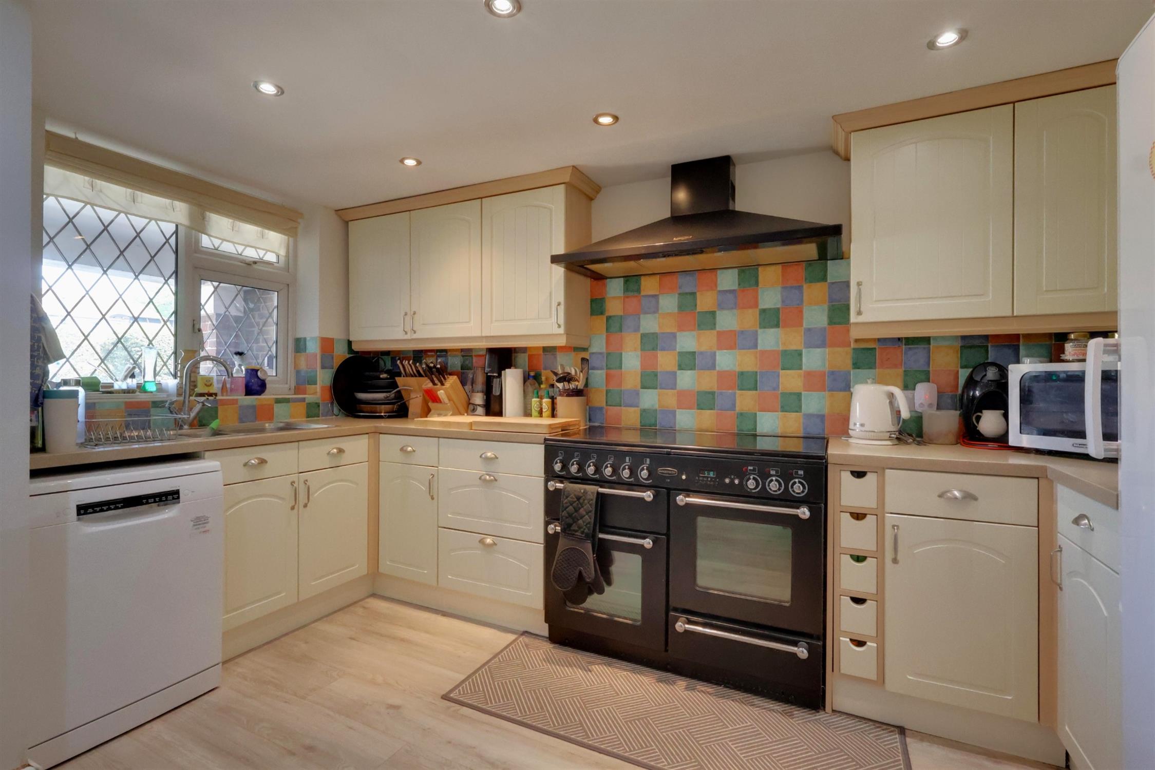 A range of wall and base cupboards with work surface over. Range style oven with extractor fan over. Inset stainless steel one and a half sink unit with drainer. Plumbing for dishwasher. Radiator. Double glazed window.