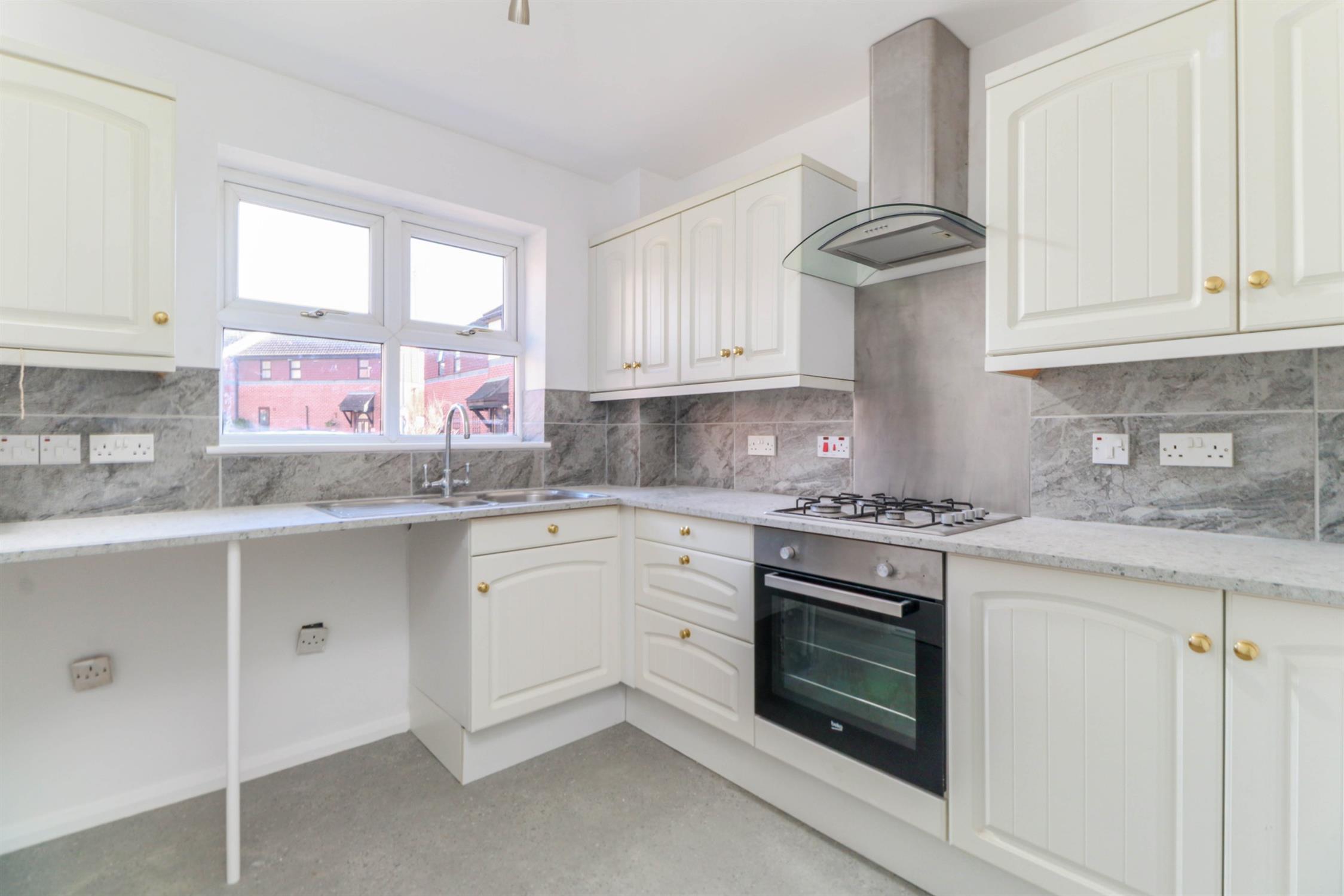 Smooth ceiling, double glazed window, range of wall and base mounted units with work surfaces over, inset stainless steel sink and drainer with mixer tap over, integrated electric oven and gas hob with extractor fan over, space for appliances, part tiled walls, vinyl flooring.