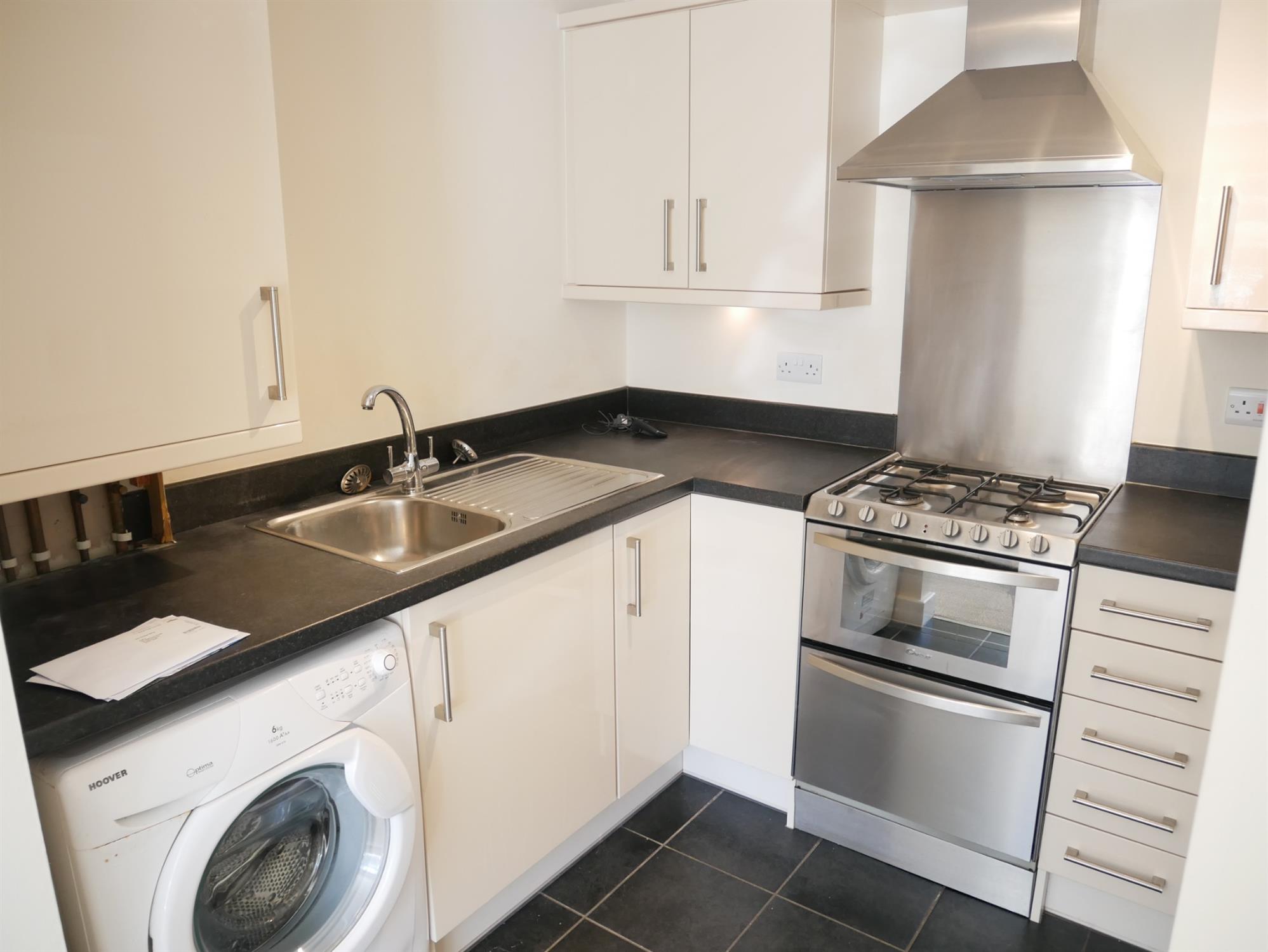 KITCHEN - Open plan modern fitted kitchen with washing machine, fridge freezer and cooker which has combined gas oven with dishwasher underneath.