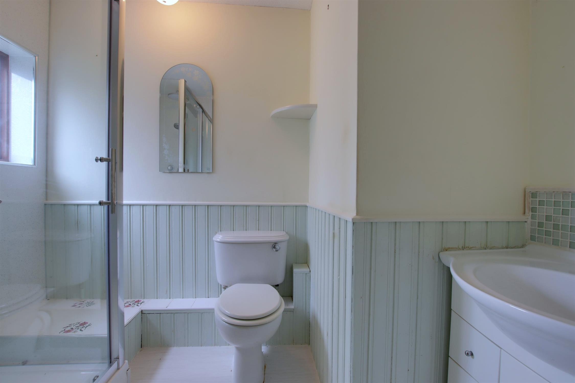 Double glazed window to the front aspect. Suite comprising; shower cubicle, wash hand basin and low level WC. Heated towel rail. Part aquaboarding splashback. Vinyl flooring.