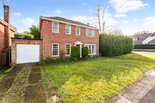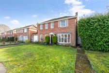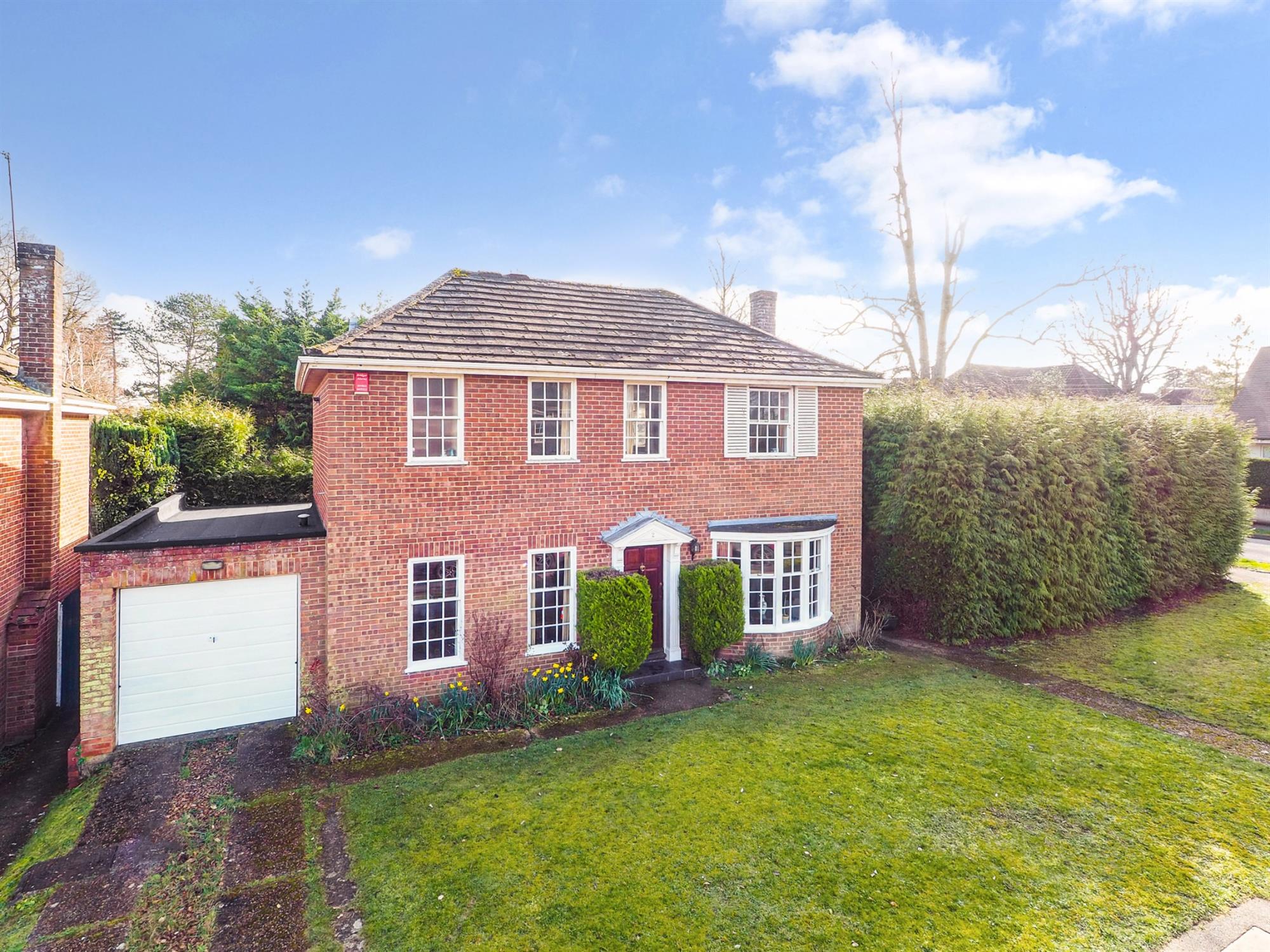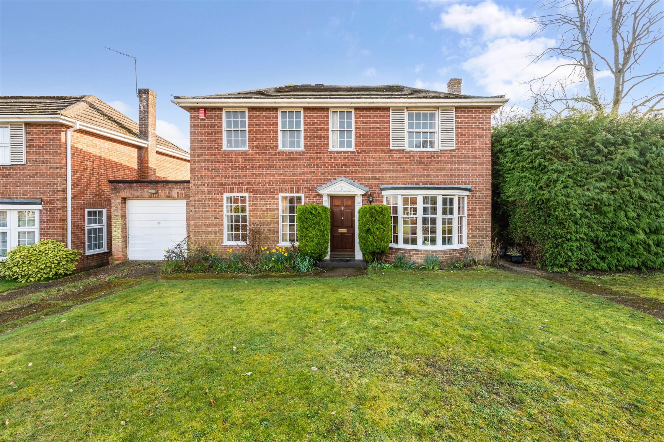 To the front of the property is a generous lawn, with a driveway for two cars leading to the garage. A path leads to the front door in portico.