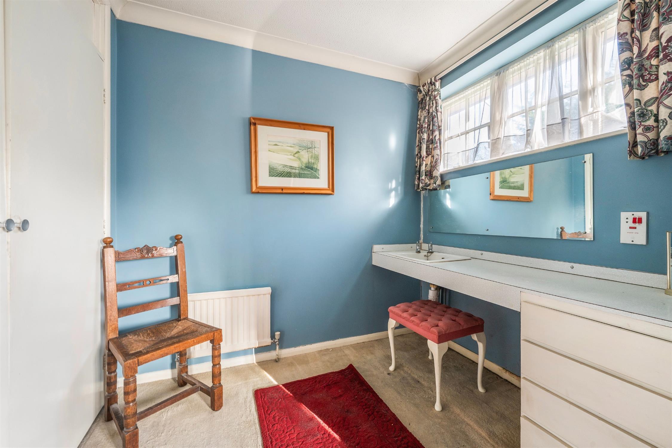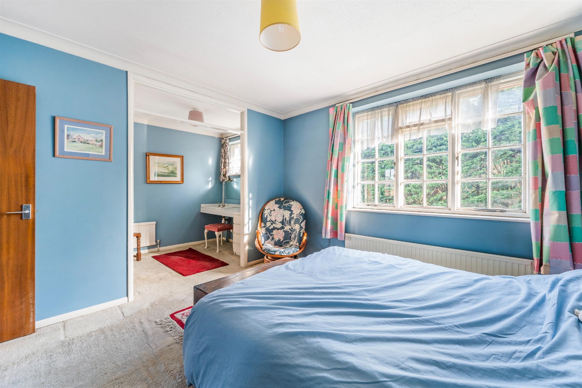 A large bedroom with separate dressing room space offering dressing sideboard with sink and large double wardrobe.