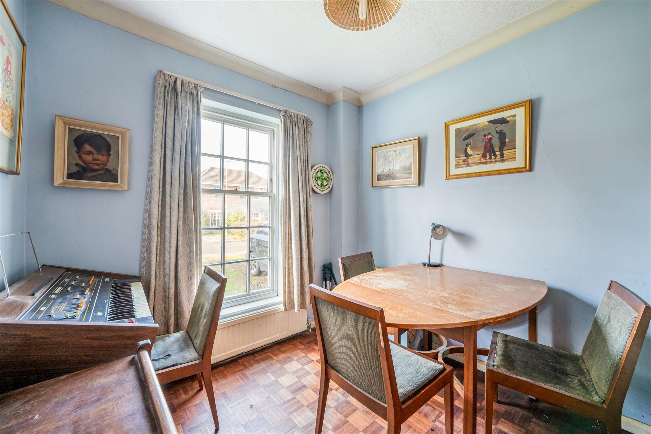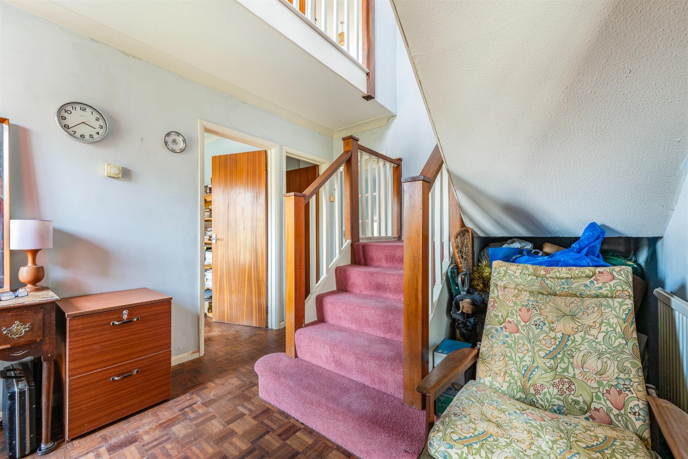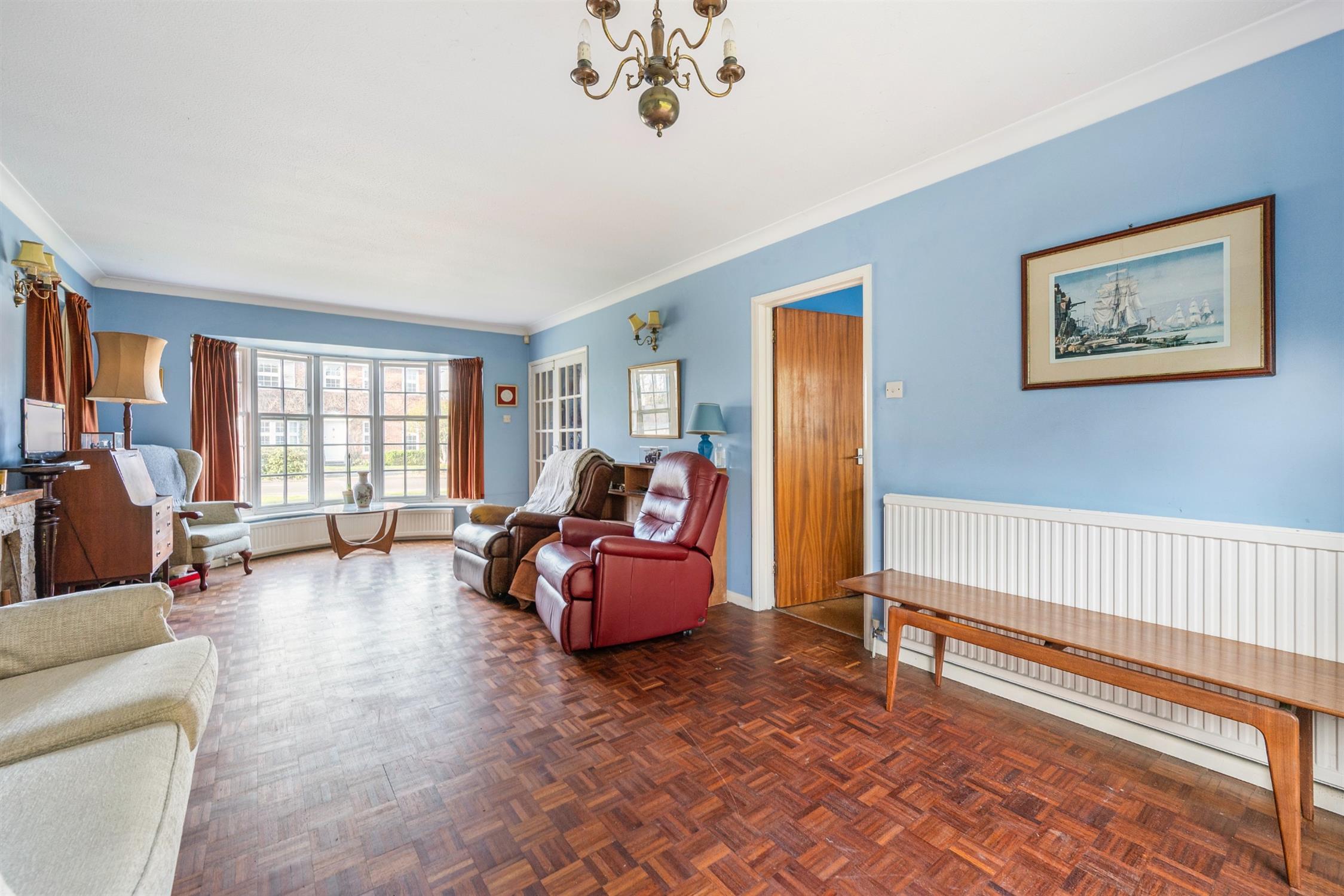 The large entrance hall has stairs rising to the gallery landing and doors to all ground floor accommodation. Original solid wood parquet flooring continues throughout the hall, study and living room.
