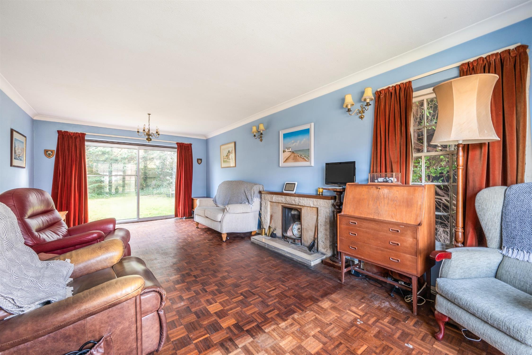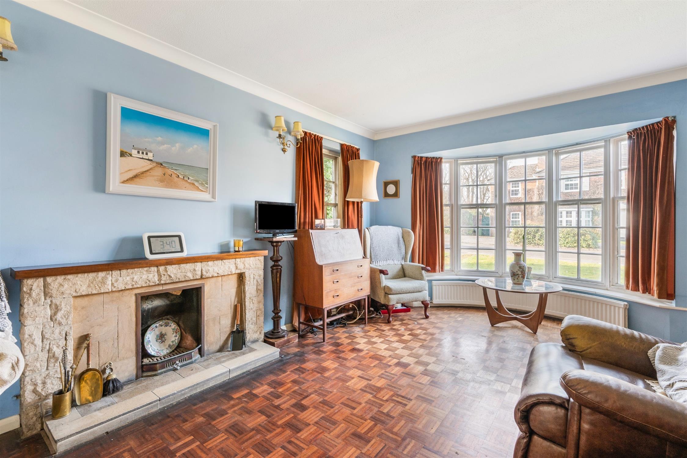 A particularly large triple aspect living room, with fireplace, hearth, surround and mantle, bay window, sliding doors to the rear garden and door to the kitchen.