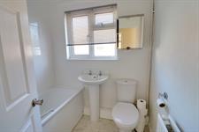 Panel enclosed bath with electric shower over, low level WC, wash basin in pedestal, radiator, side aspect double glazed window.