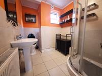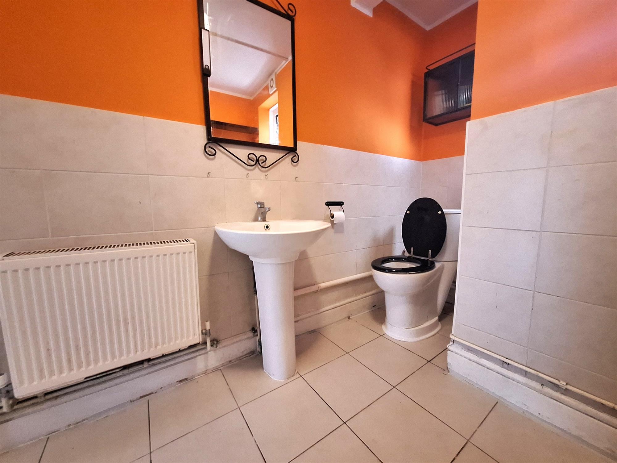 Comprising a low-level WC, corner shower enclosure, and ceramic wash hand basin. Radiator. Tiled flooring. Extractor fan. Double-glazed windows to the front aspect. Partially tiled walls.