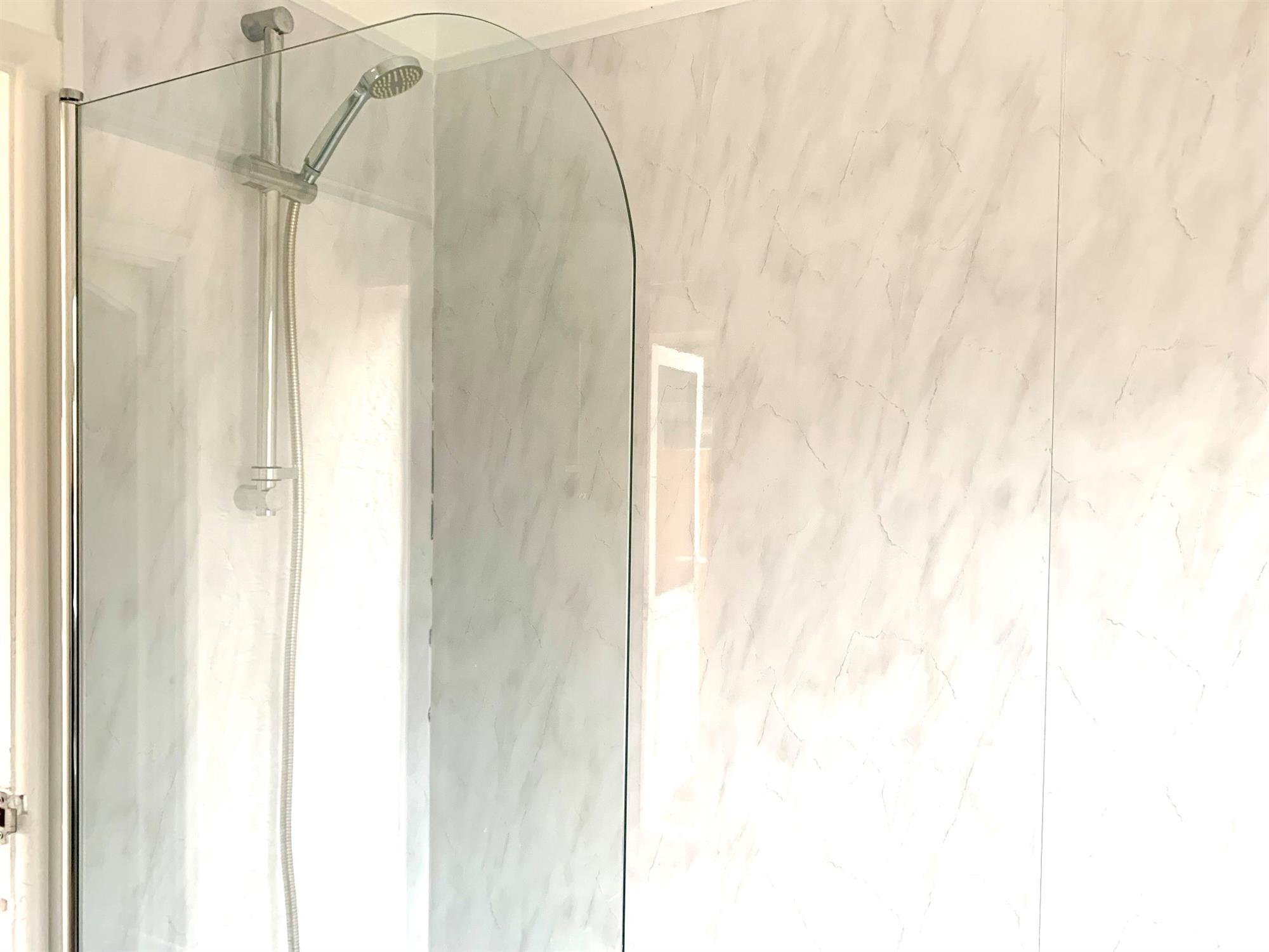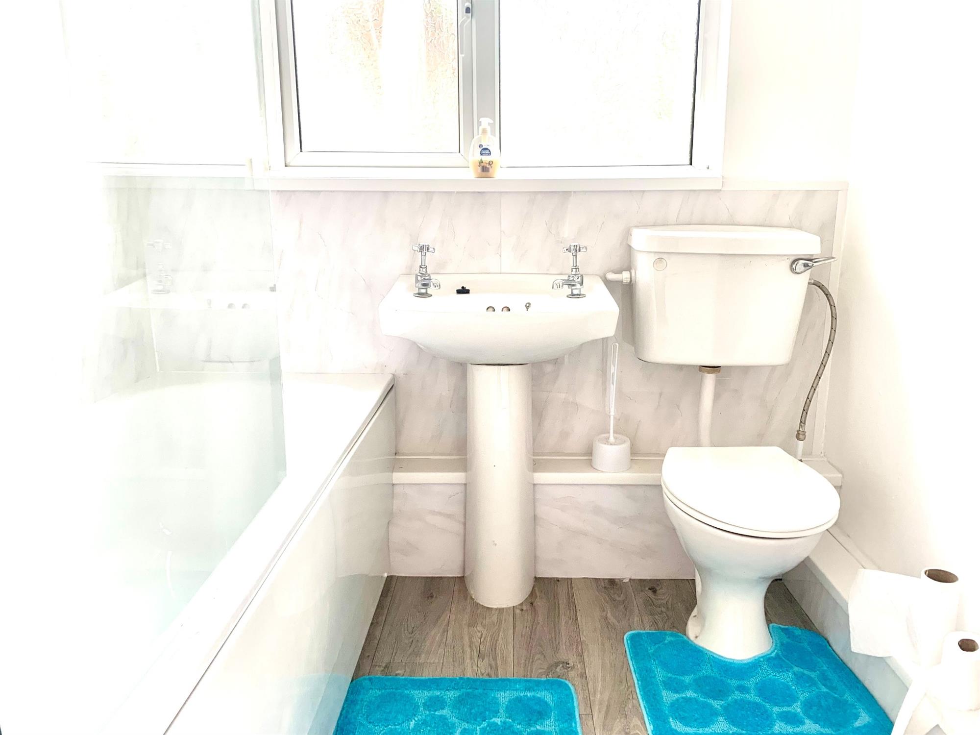 BATHROOM: White suite with bath with shower over, toilet and sink. Window to rear.