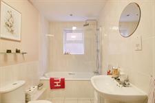 Fitted with a white suite incorporating a panelled bath with mixer tap shower attachment over. WC. Pedestal basin. Tiled floor and tiling. Heated towel rail.