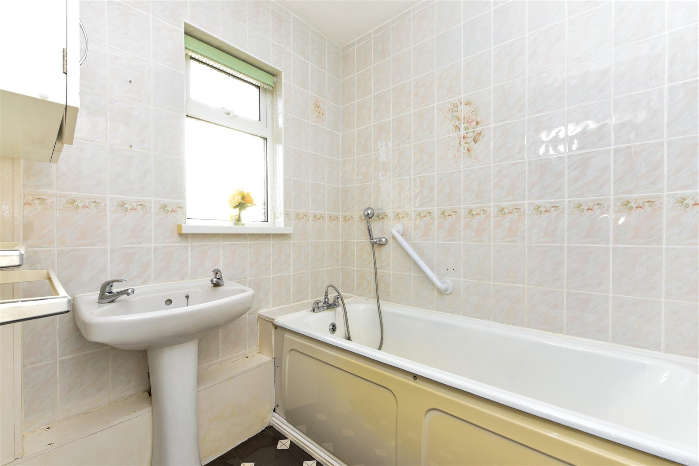 Fitted with a white suite comprising, panelled bath with mixer tap, shower attachment over. Pedestal wash hand basin. Tiling. Double glazed window to the front aspect.