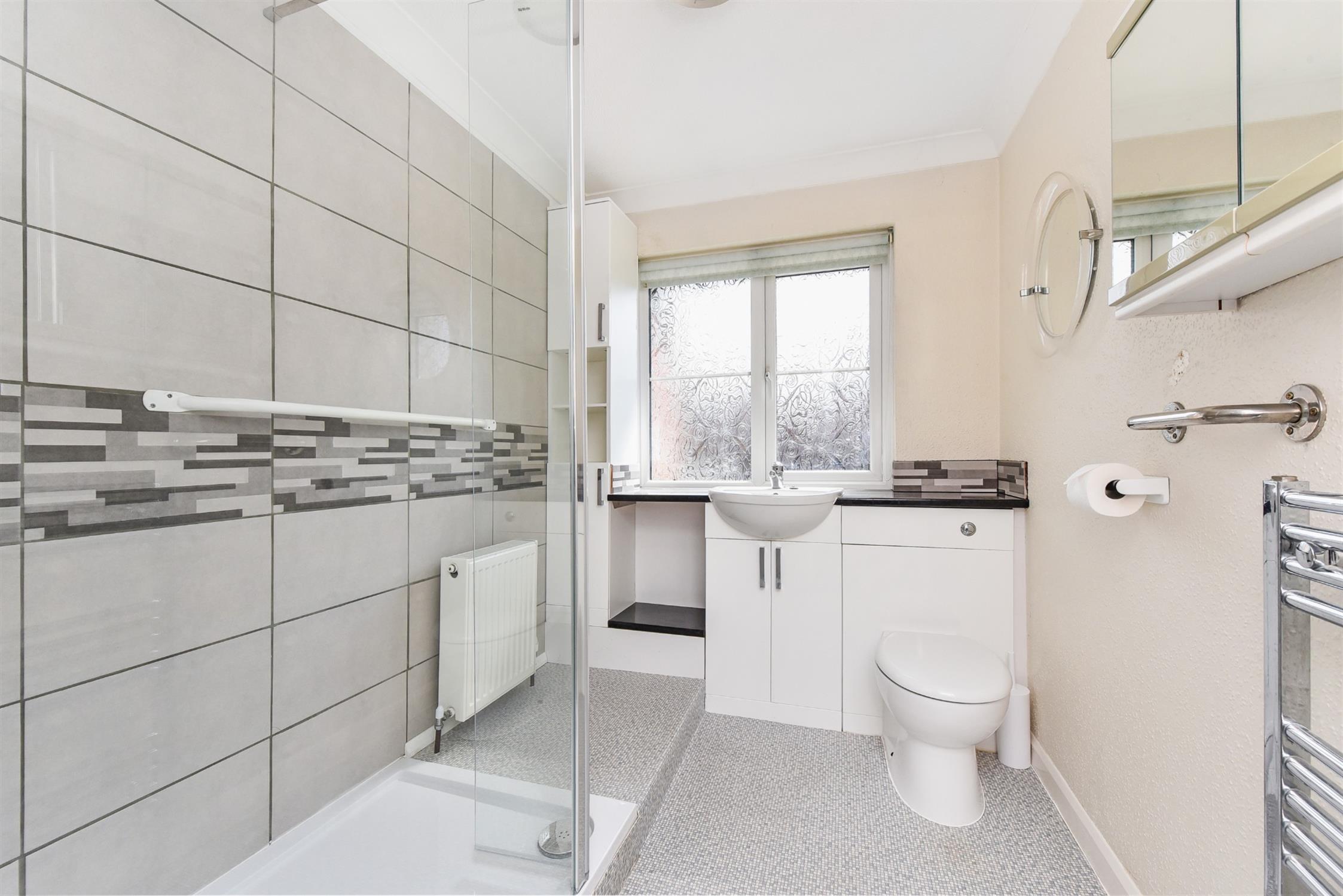 Vanity unit with wash hand basin. WC. Shower cubicle . Radiator. Tiling. Double glazed window to the front aspect.