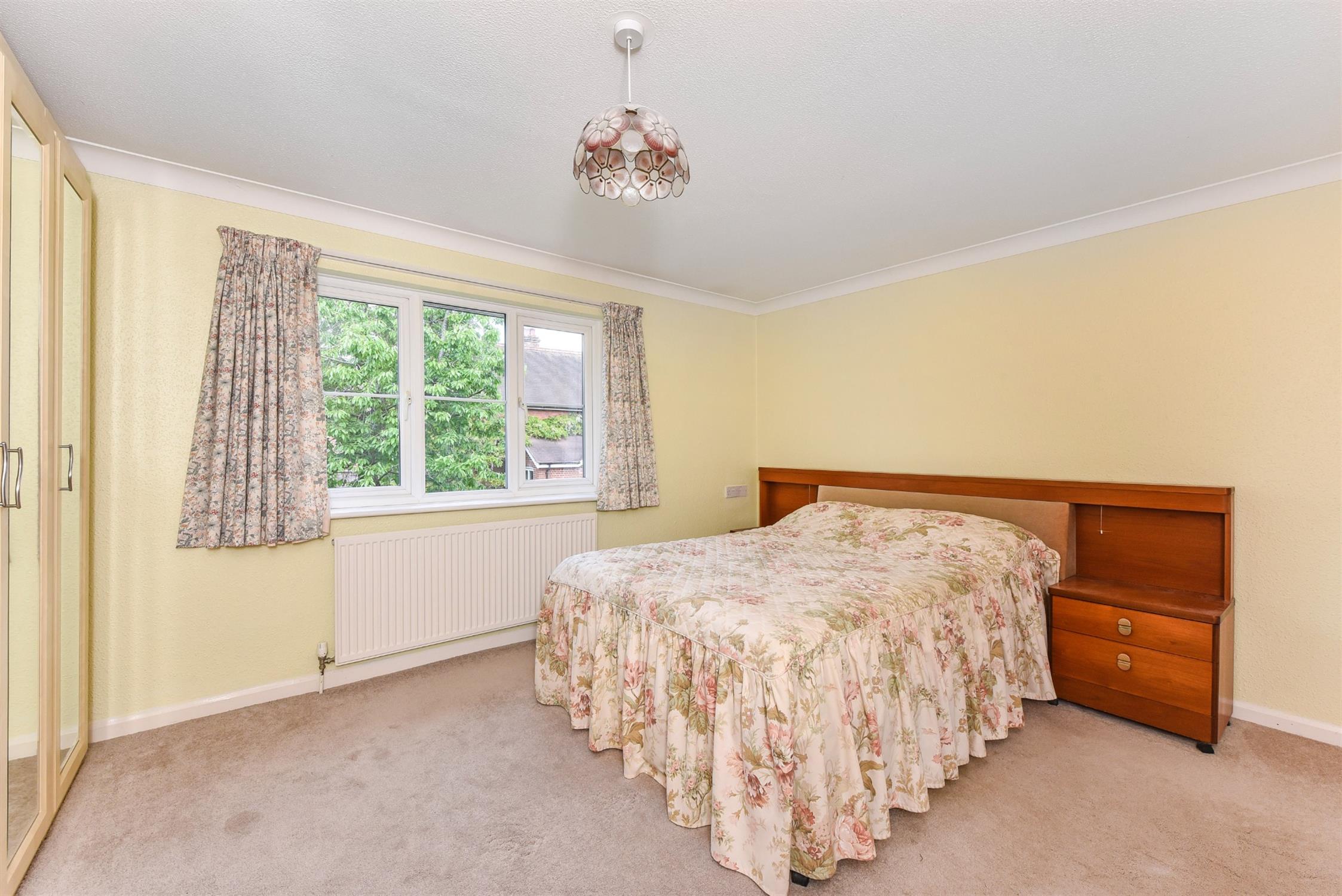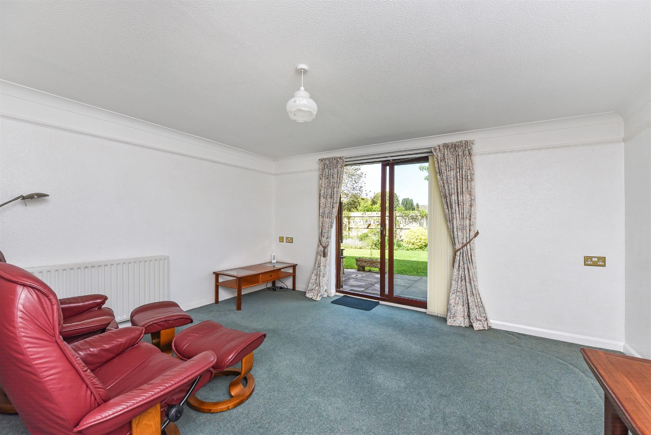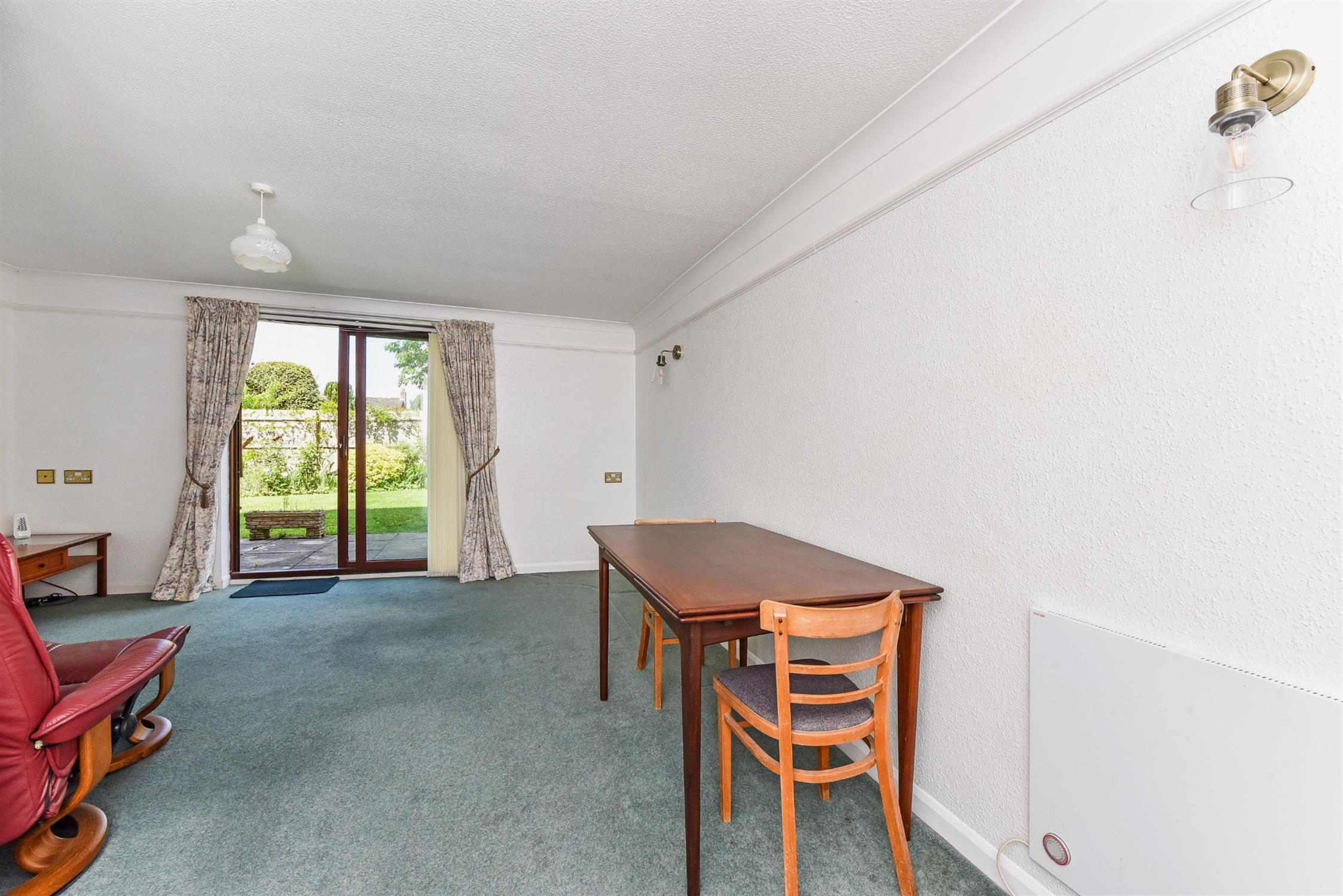 Spacious room with double glazed sliding patio doors overlooking and leading to the patio and communal gardens. Under-stairs storage cupboard. Radiator and additional electric panel heater.