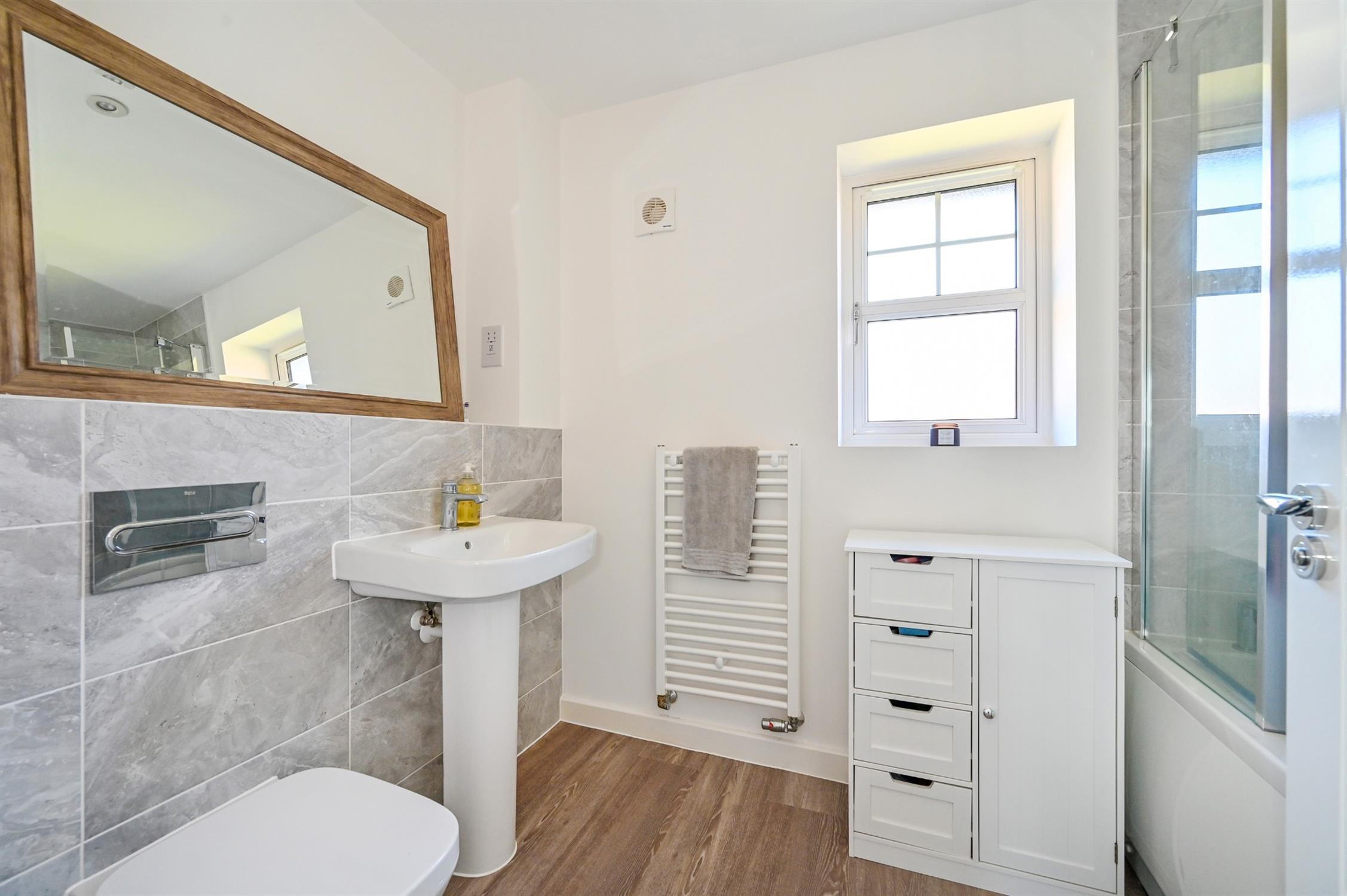 Double glazed window to the rear aspect. Fitted with a white suite comprising bath with mixer tap and shower over. Pedestal sink with mixer tap over. WC. Tiling. Heated towel rail. Extractor fan. Inset lighting.