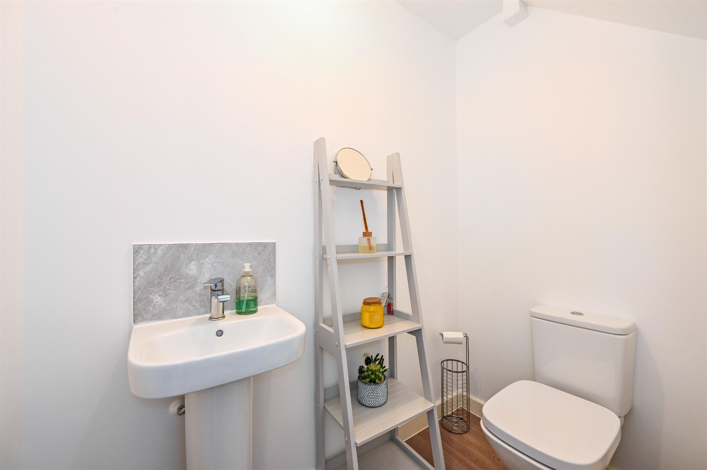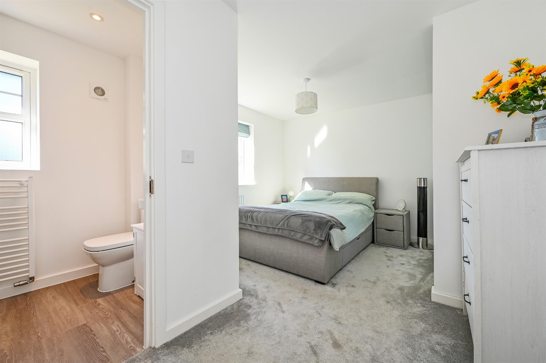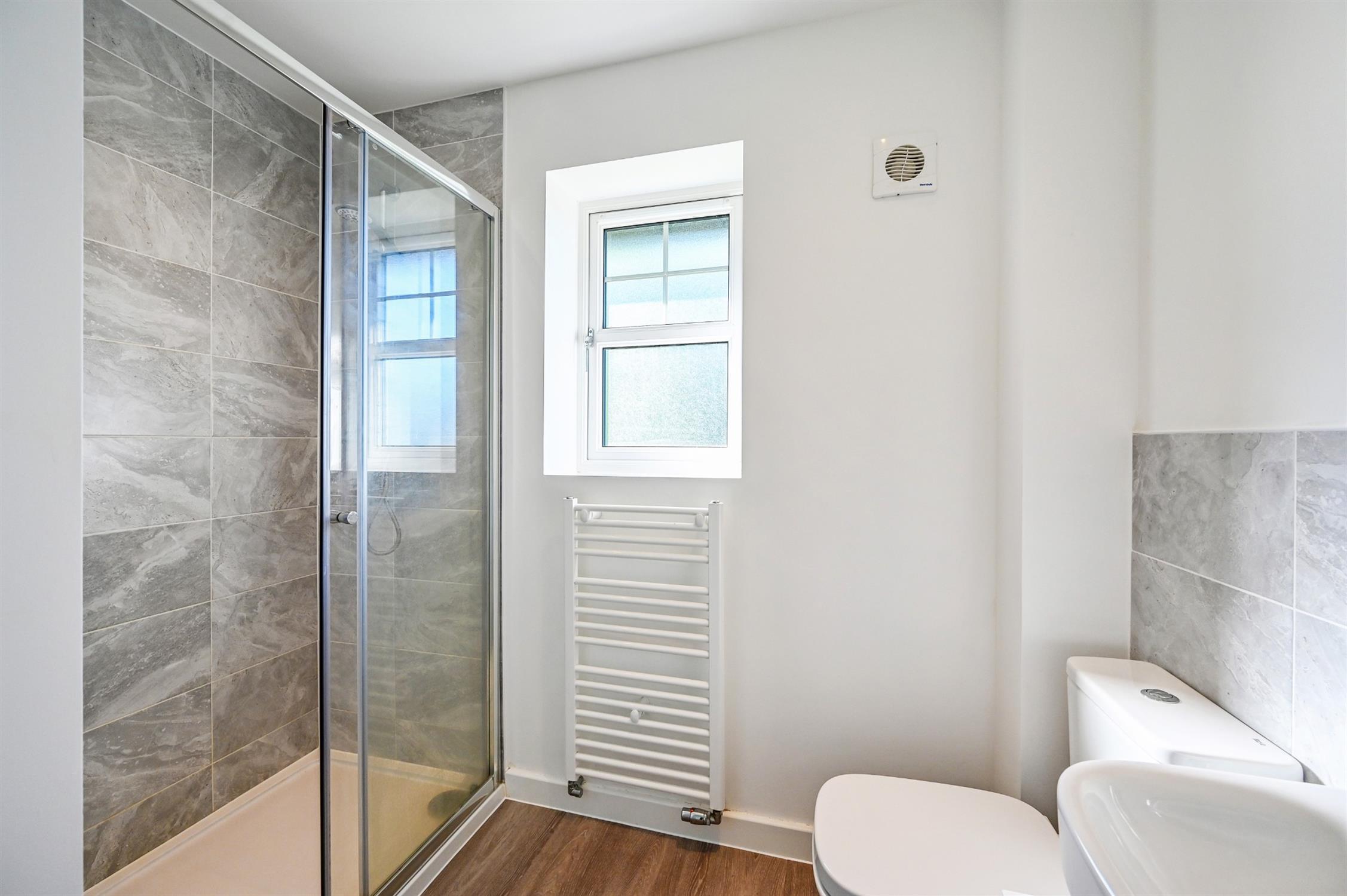 Double glazed window to the front aspect. White suite comprising walk-in shower and shower attachment. Pedestal sink with mixer tap over and cupboard storage under. WC. Tiling. Heated towel rail. Extractor fan. Inset lighting.