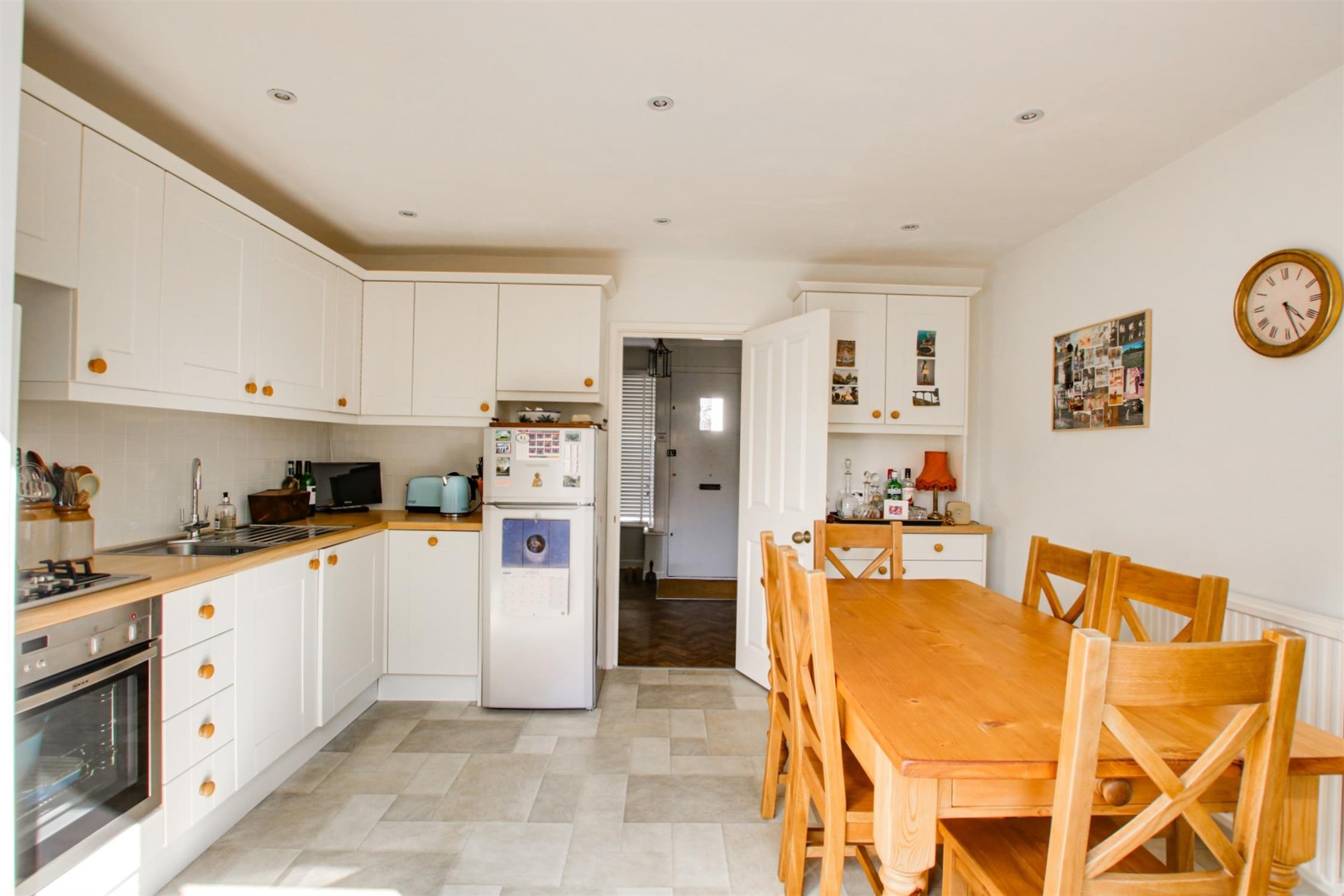 From the hall you enter the kitchen diner. The kitchen has contemporary Shaker style cream units, built in electric oven and gas hob, built in washing machine / dryer, built in dish washer and wood effect countertops. The left side of the kitchen has room for a six seater table and chairs and has a built in Shaker style Welsh dresser. Double glazed doors take you outside to a delightful walled courtyard with a patio and well maintained borders. The first floor landing takes you into the sitting room with a large double glazed westerly facing window. Along the landing is an airing / linen cupboard and at the end of the landing is a single bedroom which is used as a study having a built in cupboard / wardrobe. The second floor landing takes you to two double bedrooms, the second bedroom has a large built in wardrobe. The bathroom is floor and wall tiled with a P - shaped bath and heated radiator towel rail. The loft access has an attached extending ladder. No forward chain.
