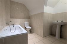 BATHROOM: Modern white suite comprising WC, wash hand basin, bath with shower attachment and heated towel rail.