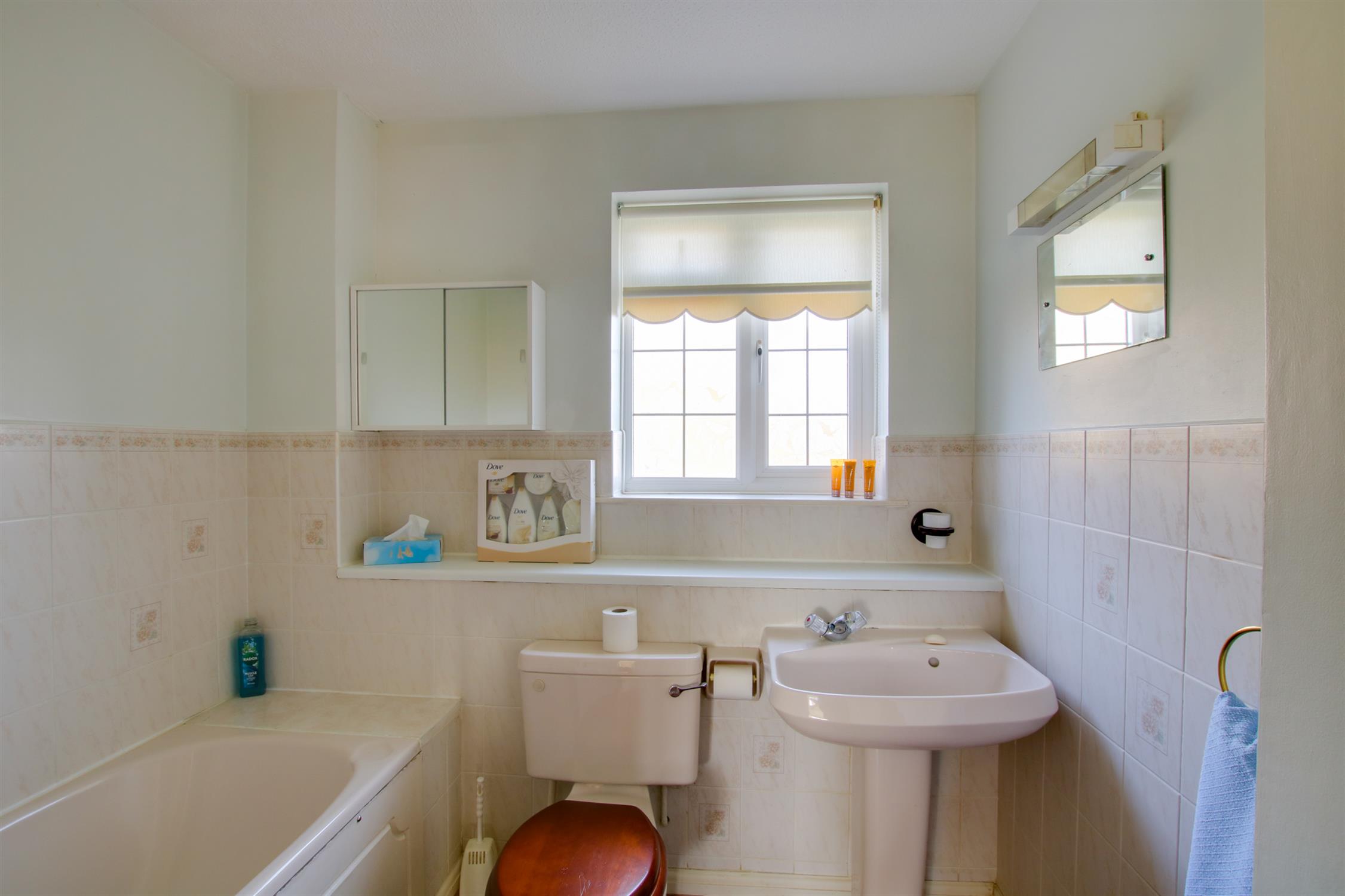 Fitted suite comprising panelled bath with mixer shower attachment over, low level WC and wash hand basin. Double glazed window to the rear aspect. Radiator.