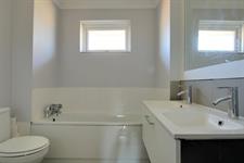 White suite comprising: low level WC, vanity unit with twin wash hand basins, bath and shower cubicle. Chrome heated towel rail. Double glazed window to the rear aspect.