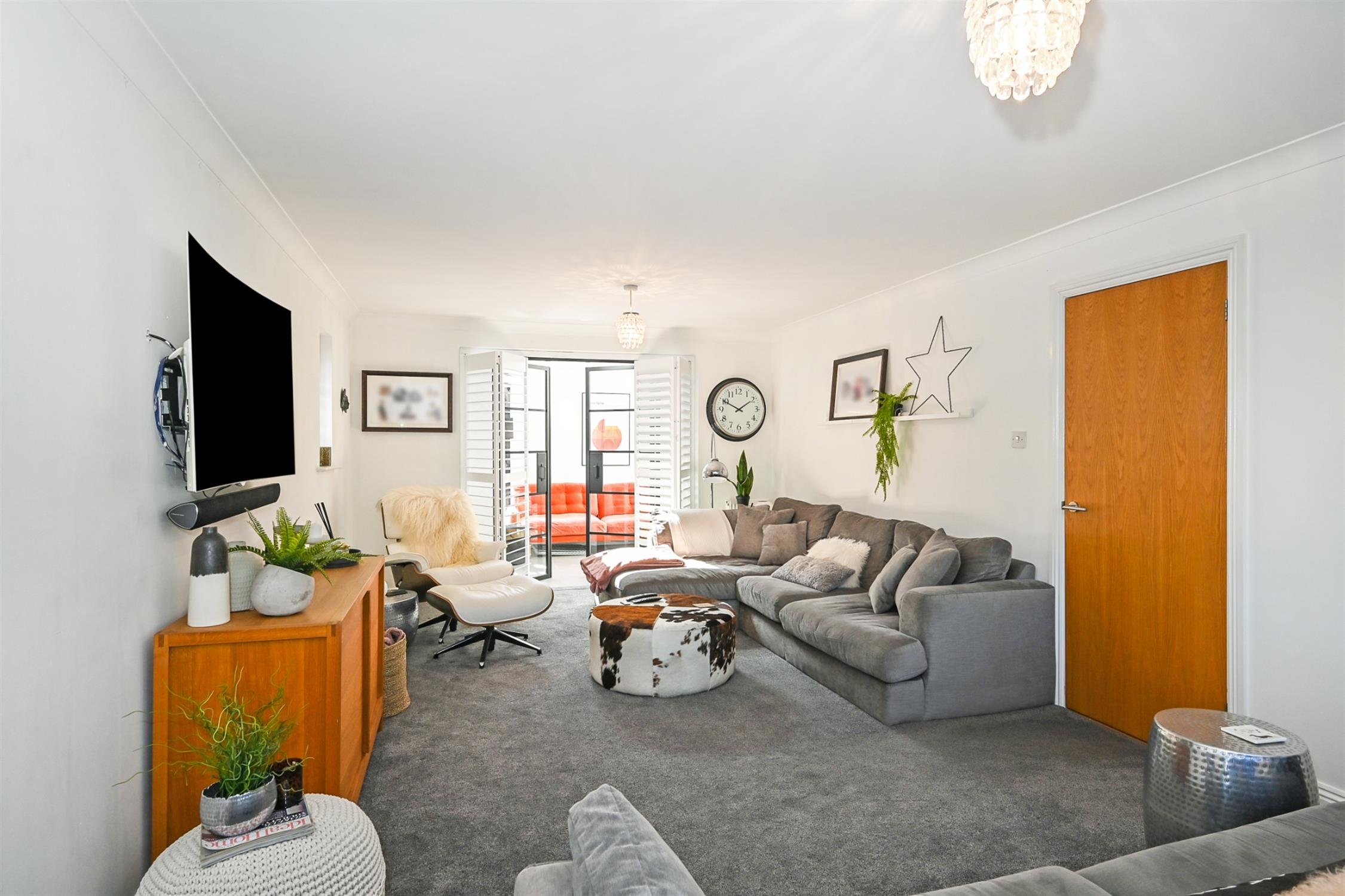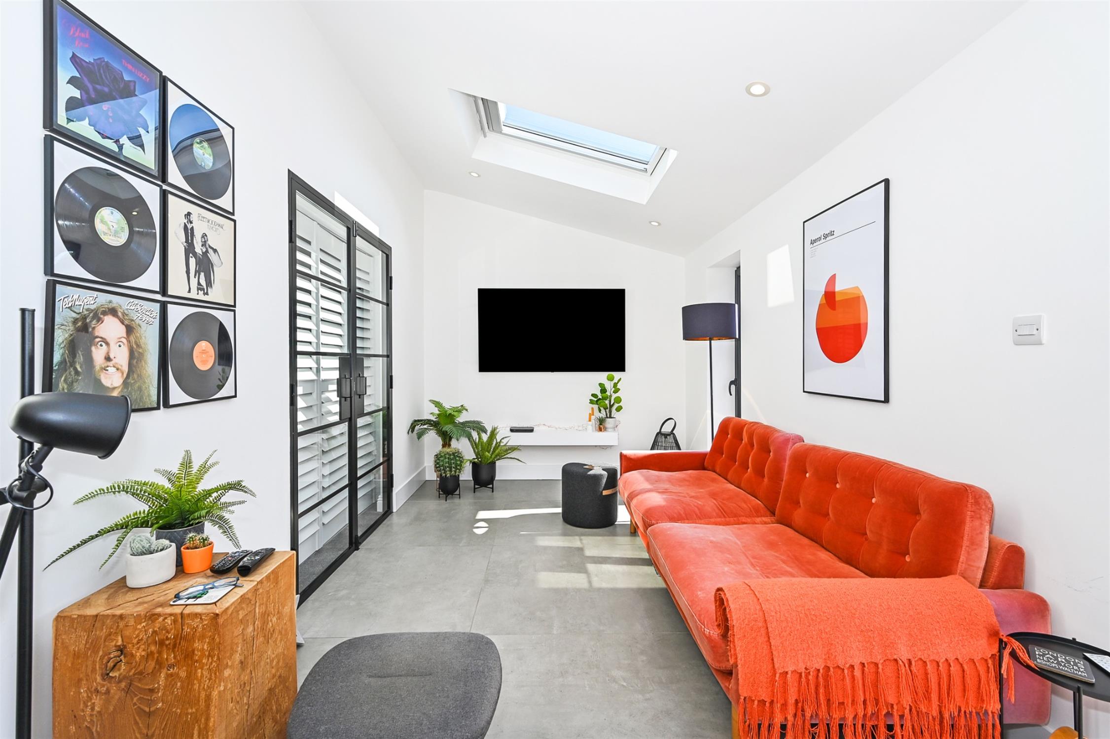 A generous size sitting room with a window to the front and side aspect. There are a pair of french doors with fitted shutters opening to the living area of the open plan kitchen/dining/living room.