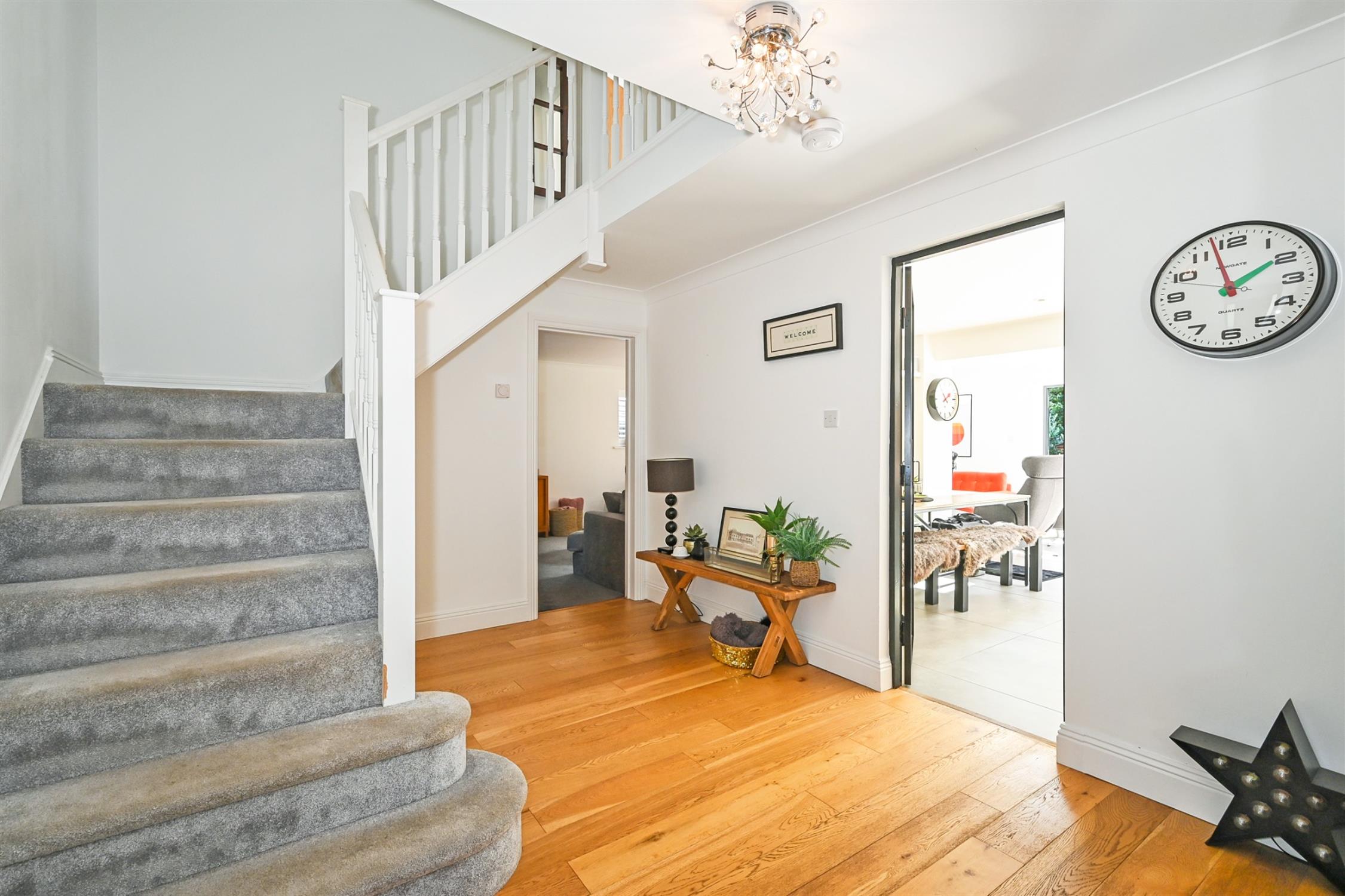 Spacious entrance hall, fitted with engineered wood flooring. Stairs leading to the first floor with fitted pull out cupboards ideal for shoe storage. Inset bench and cloaks hanging area with shelf above.