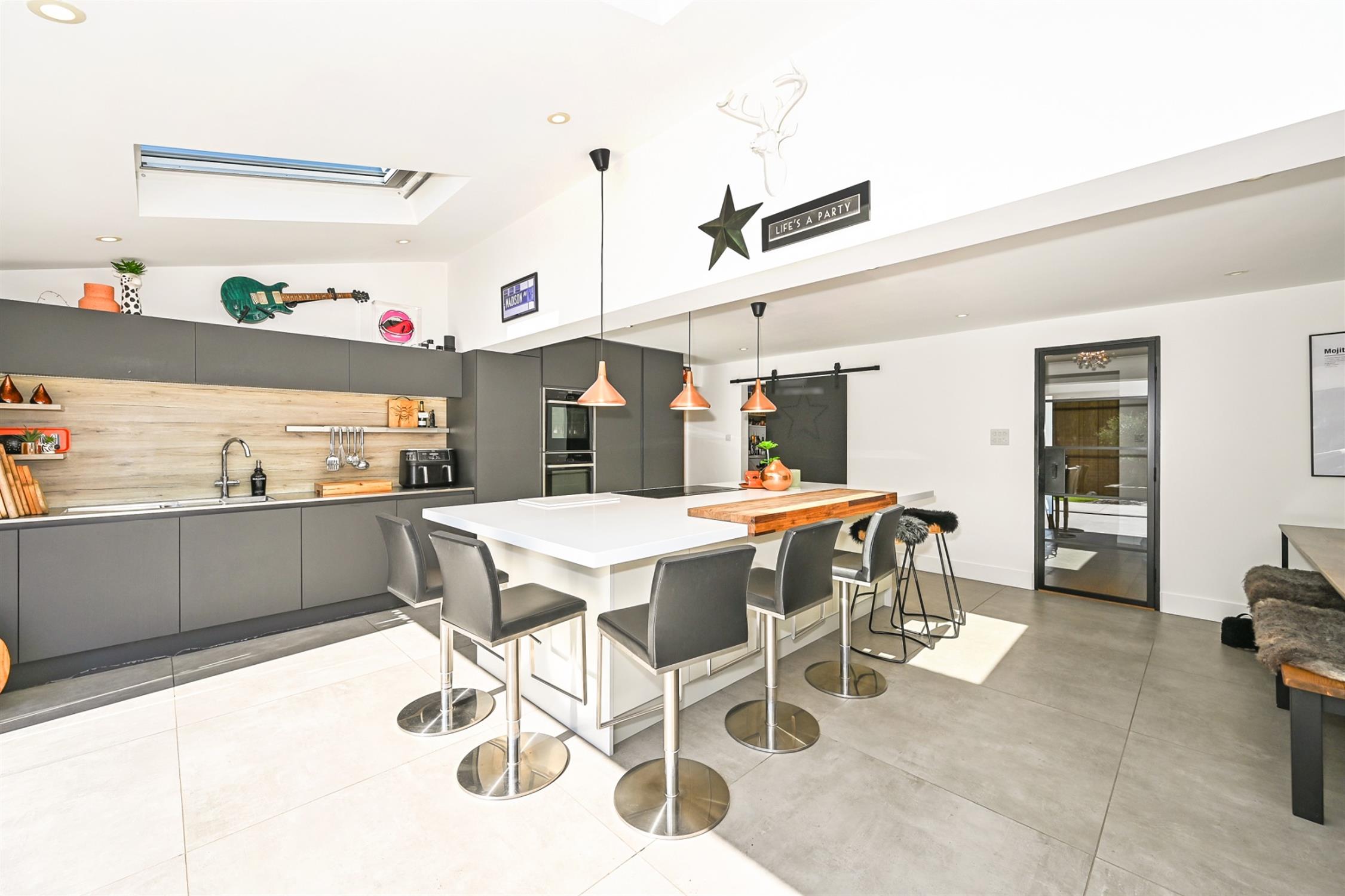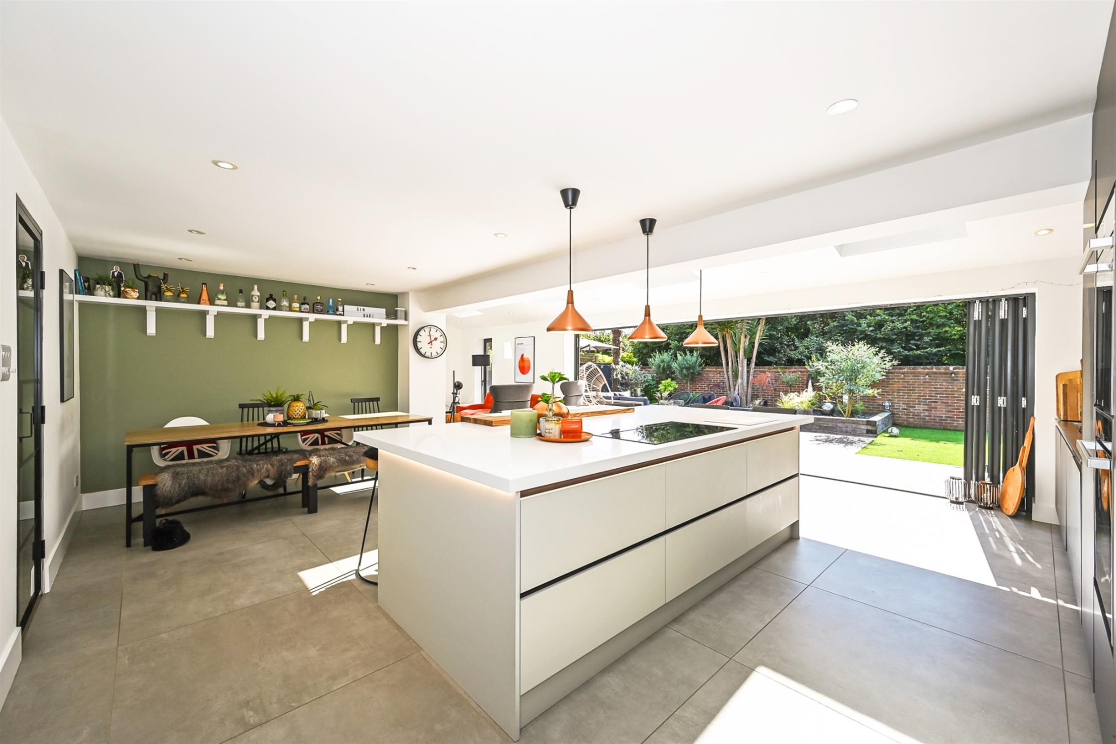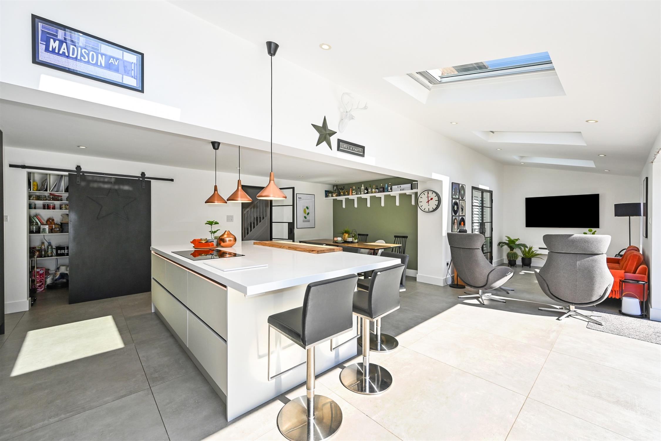 Superb, light and spacious open plan kitchen, dining and living area with bi-fold doors opening onto the southerly aspect rear garden. The kitchen has been stylishly fitted and designed with a striking kitchen centred around a impressive island with Corian worksurface, incorporating storage and drawer units with bespoke lighting over. There is an electric induction hob with fitted counter extractor and seating space for seven. There is an additional range of units which incorporate two integrated Neff ovens with slide and hide doors, integrated Montpelier full height fridge and freezer. Stainless steel worksurface with integral sink. Grohe hot water tap and led lights over. Integrated AEG dishwasher and waste bins. The flooring throughout is tiled with Porcelain tiles and has underfloor heating. Velux windows are fitted with solar powered auto opening and integrated remote control, black out blinds. An impressive length of bi-fold doors on the rear aspect, opening onto the rear terrace and garden. The dining and living area flow perfectly, with the living area having an additional glazed door opering onto the garden and the option to open into the sitting room with the double French doors. Space for a dining table. Inset ceiling lighting and feature sliding door to the WALK IN PANTRY, with inset lighting, fitted shelving and tiled floor.