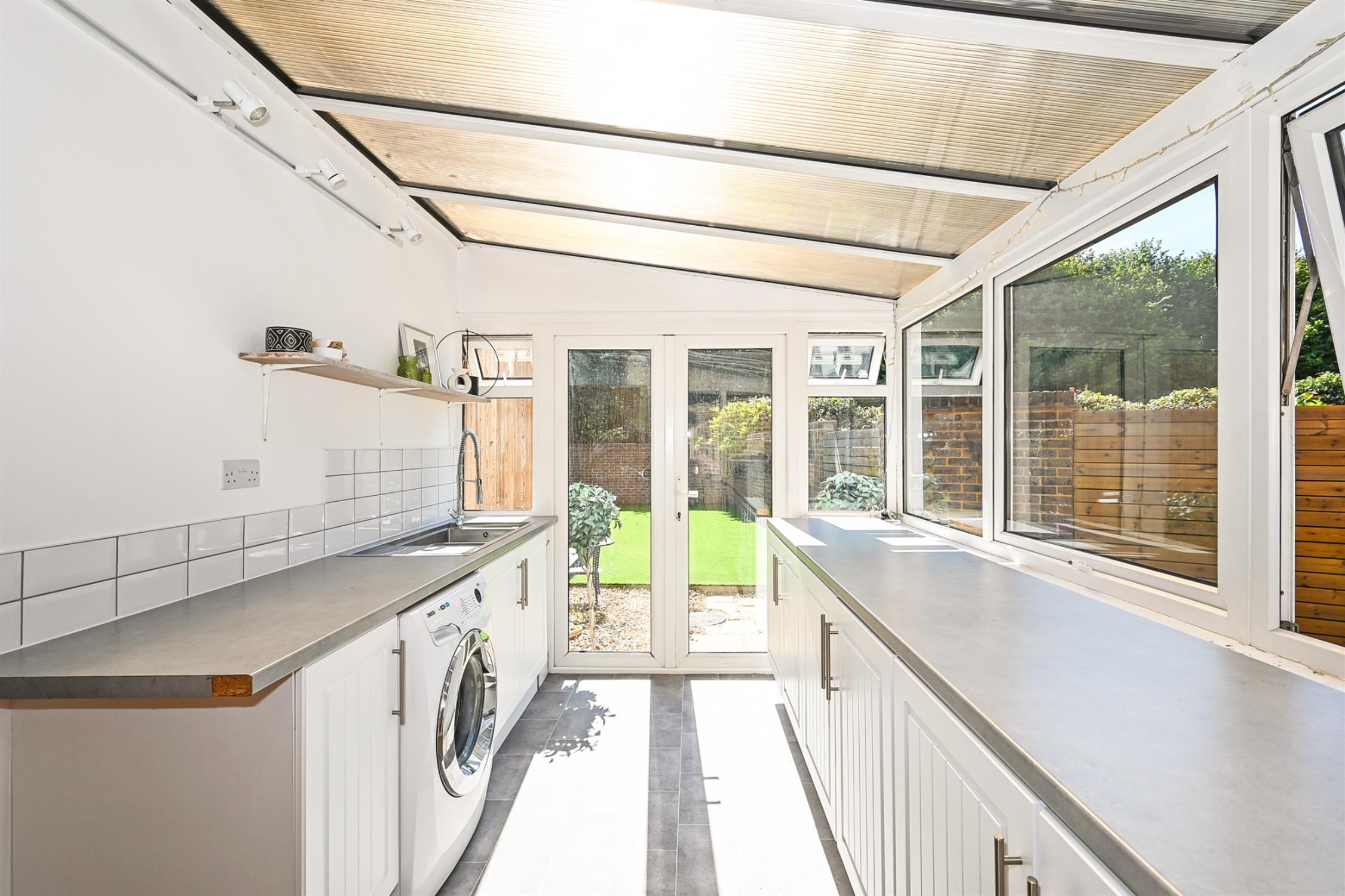 Double glazed with double opening french doors to the rear garden. There are fitted worksurfaces with base storage units beneath and a fitted Candy tumble dryer and Zanussi washing machine.