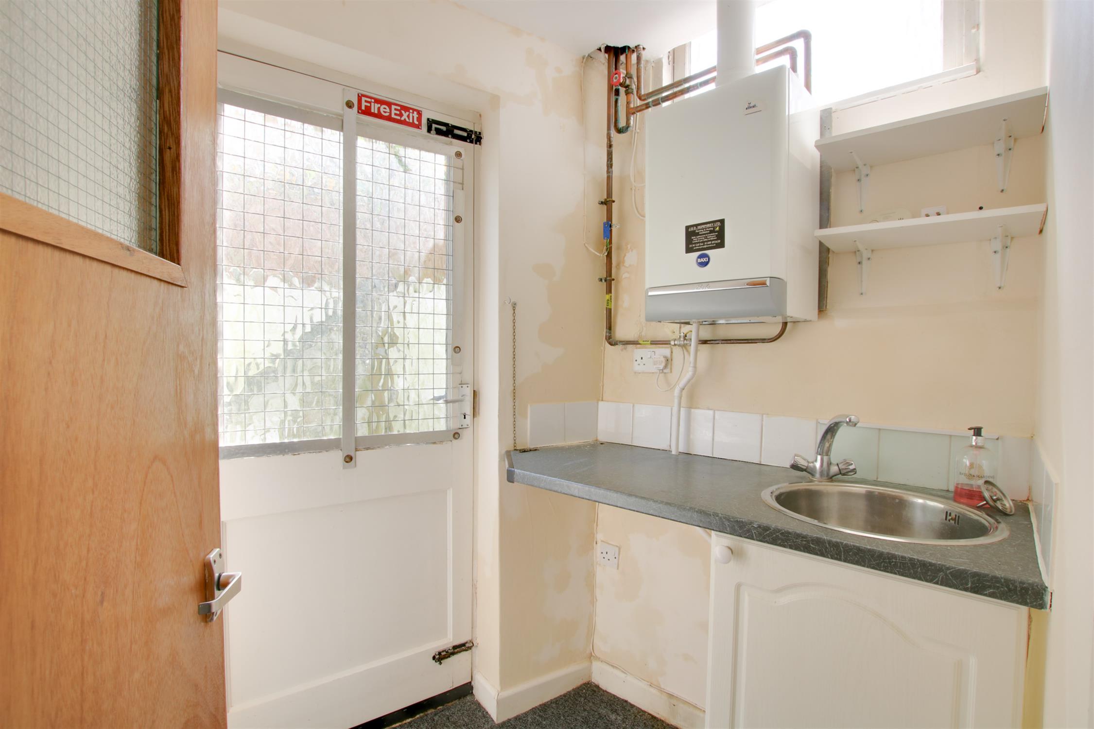 Worktops with a single storage cupboard below. Stainless steel round sink with mixer tap. Wall mounted Baxi gas fired boiler. Radiator.