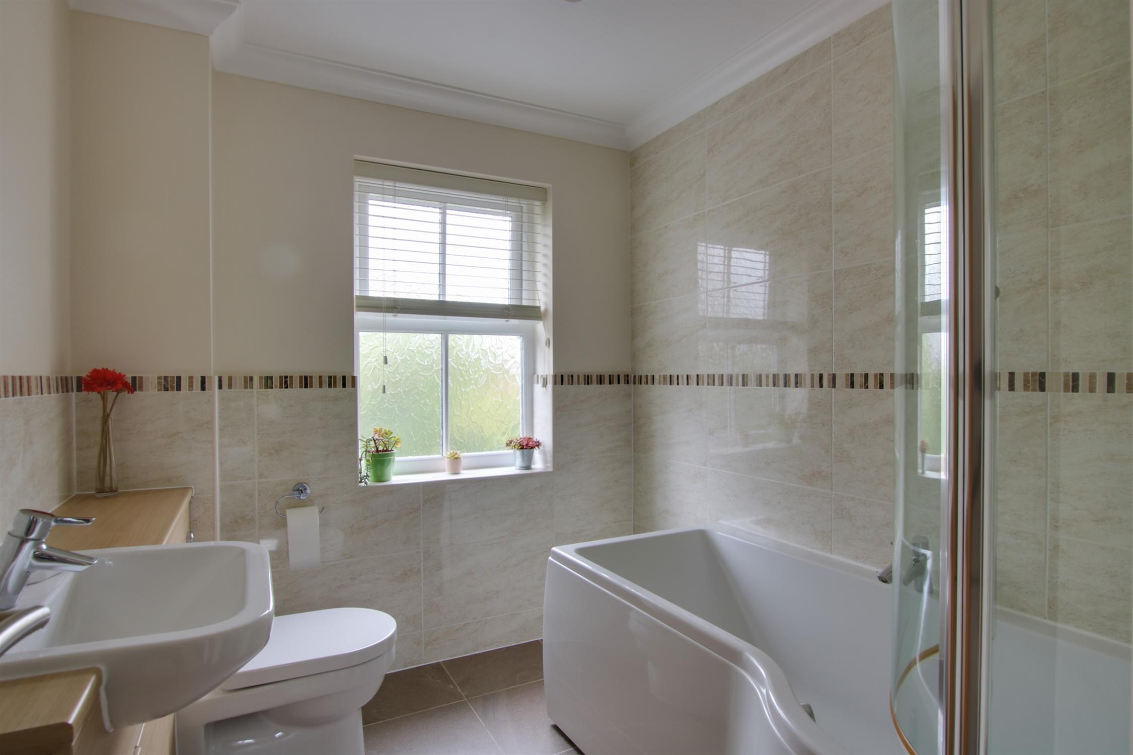 Fitted with a white suite comprising, panelled P shaped bath with shower over, tiling. Enclosed cistern WC with fitted vanity units and wash hand basin. Heated towel rail. Tiled floor. Double glazed window to the front aspect.