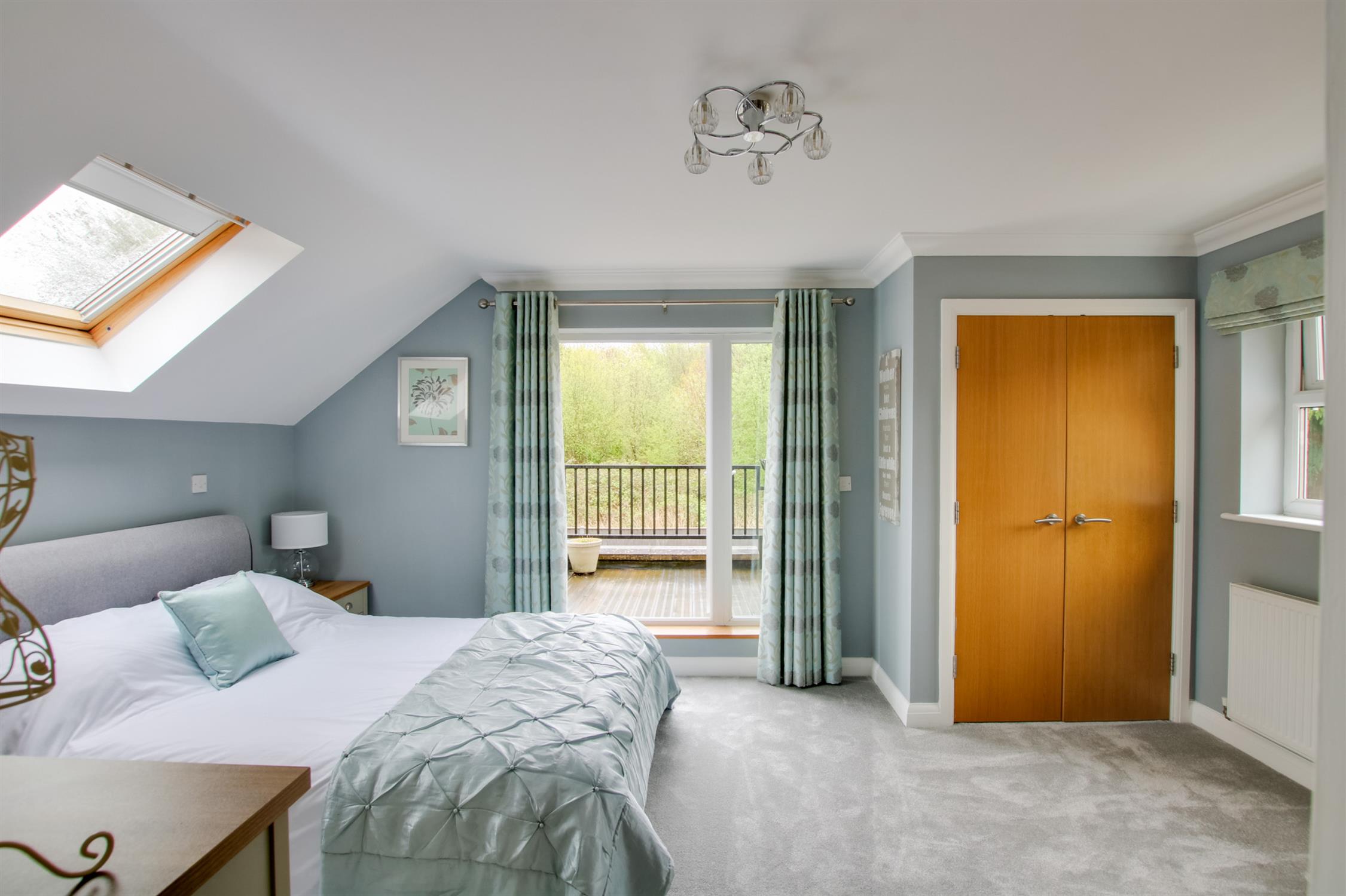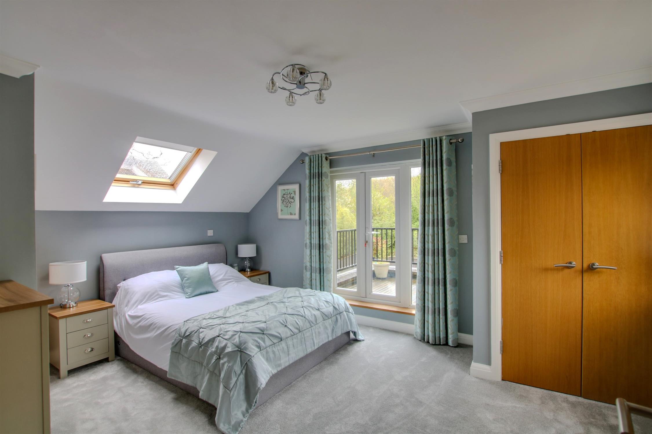 The main bedroom suite, is particularly lovely, being a good size and having double opening French doors, leading out onto a bespoke roof terrace. There are built in wardrobes. A Velux style window and a window to the side aspect. Radiator. Access to eaves storage area and door to: