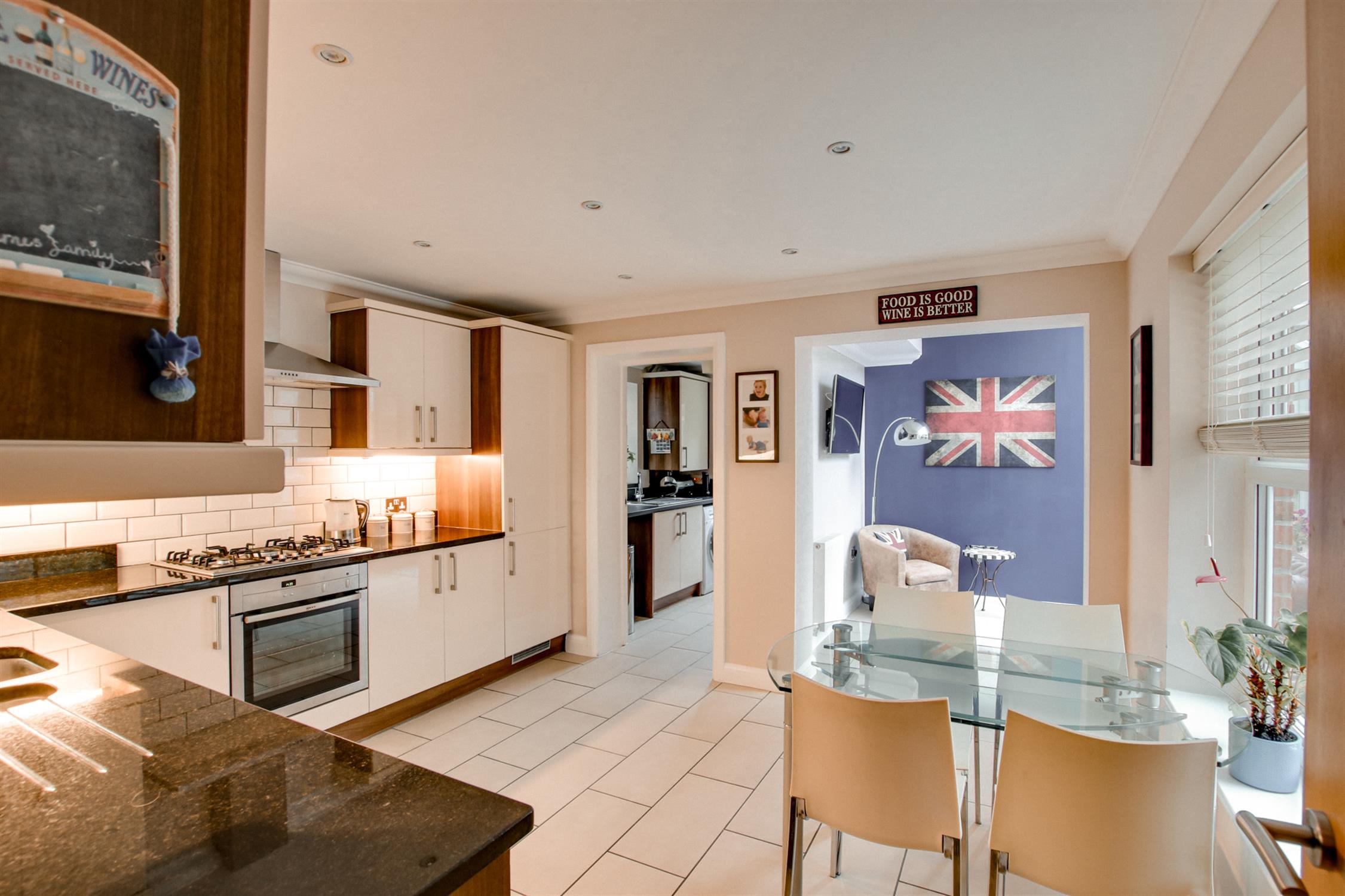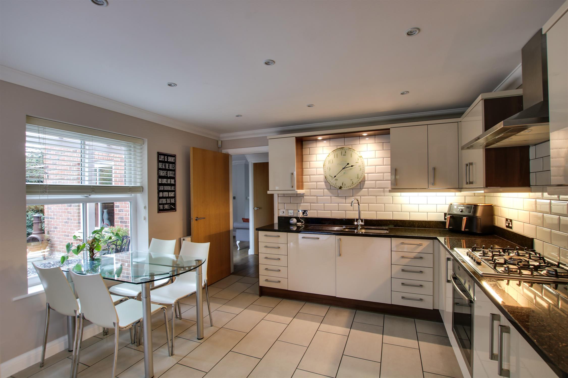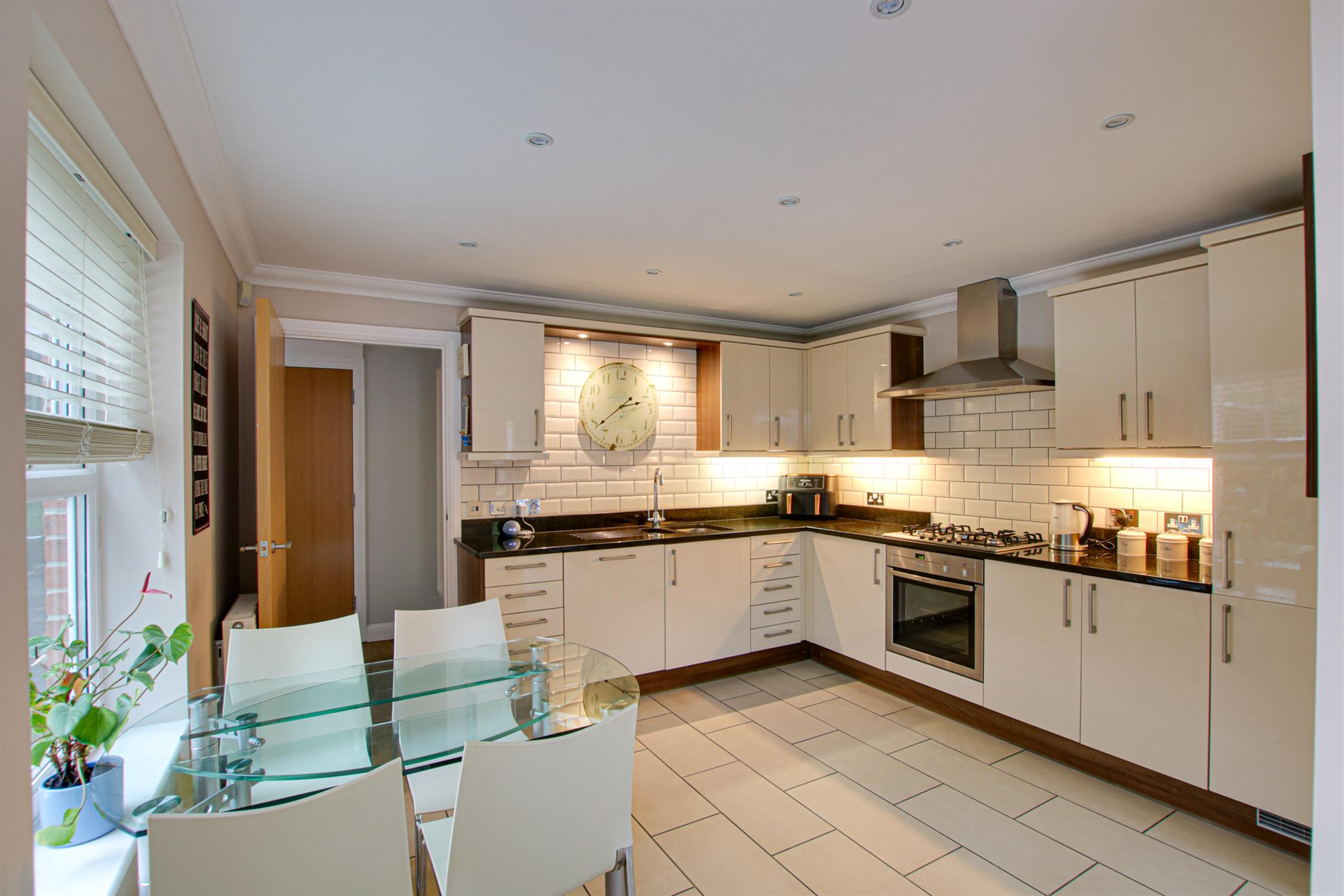Stylishly fitted with a range of drawer, wall and base units with Granite worktops, tiling and lighting over. One and a half bowl sink with mixer tap over. Integrated gas hob with electric oven below. Integrated fridge/freezer and dishwasher. Extractor fan. Radiator. Inset lighting. Space for breakfast/dining table and chairs. Double glazed window to the side aspect overlooking the garden. Opening to the snug/garden room.