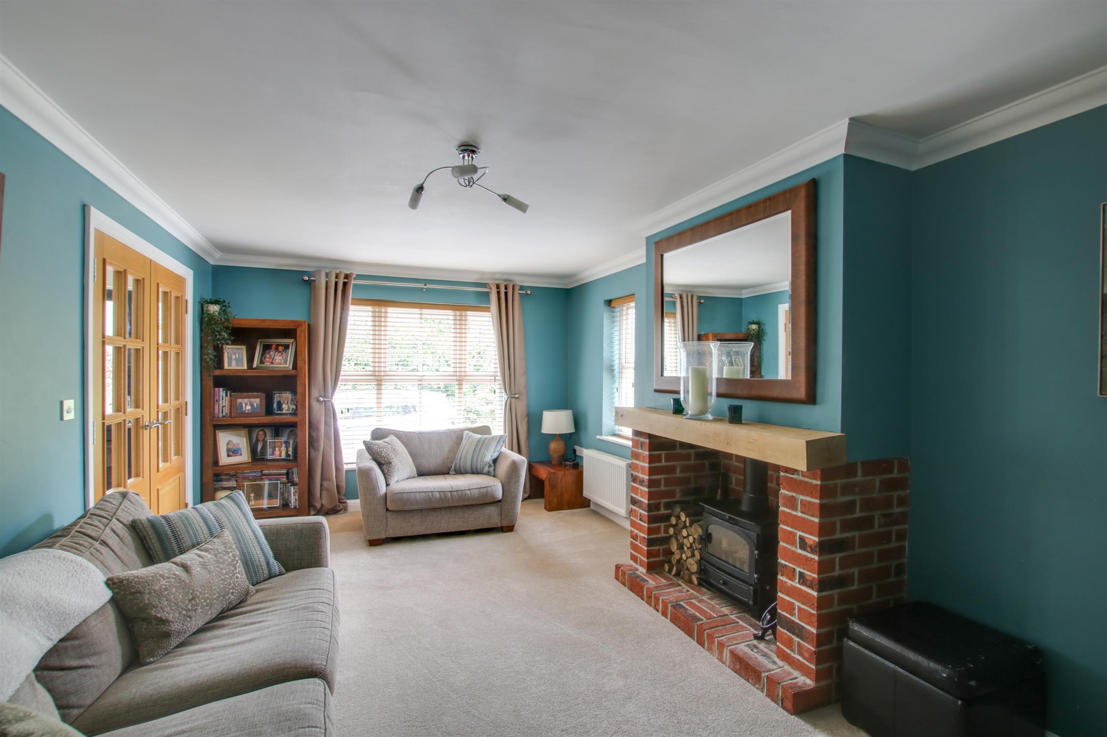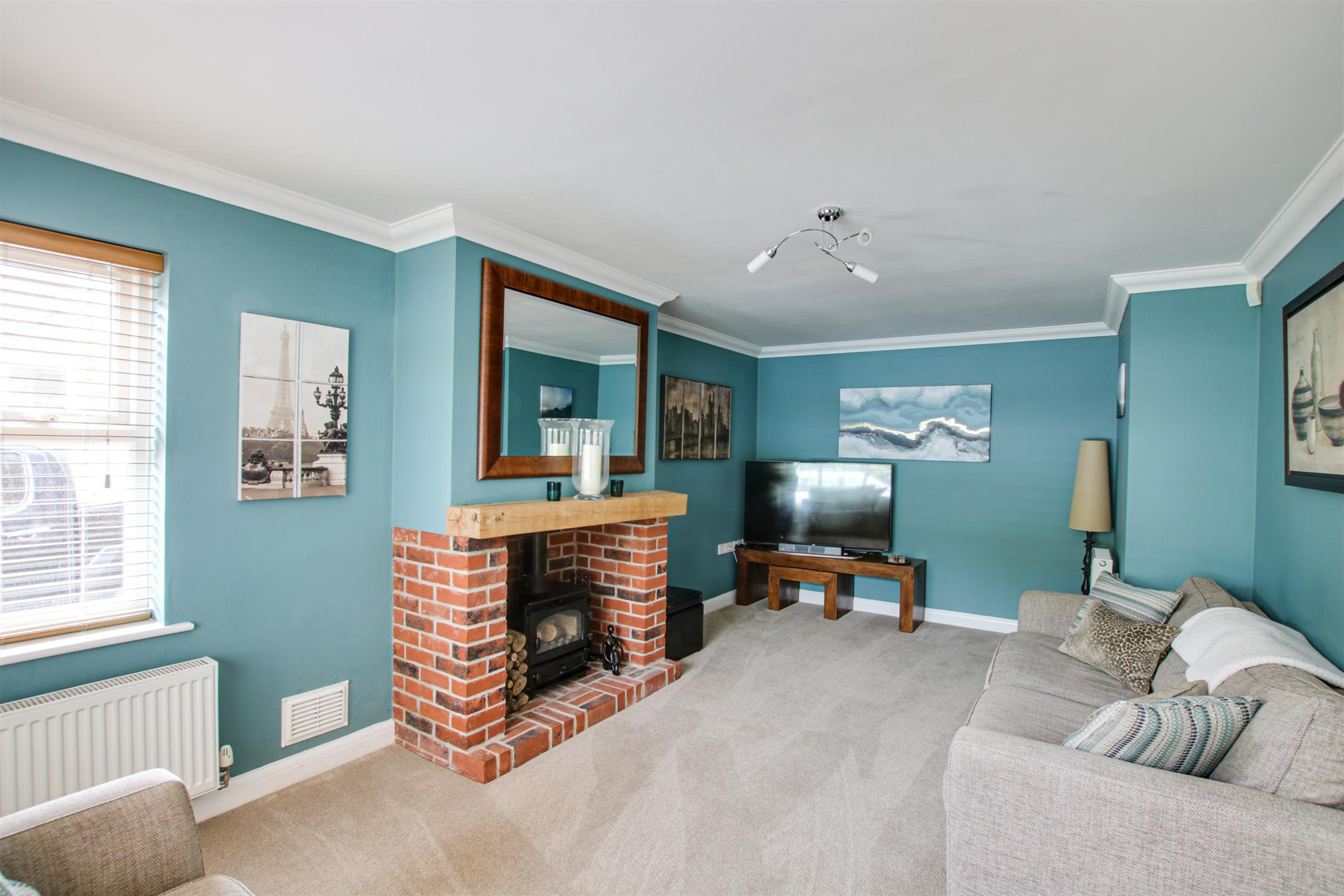 Lovely living room with a brick fireplace in the centre, with fitted wood burning stove. Double glazed window to the side and front aspects.