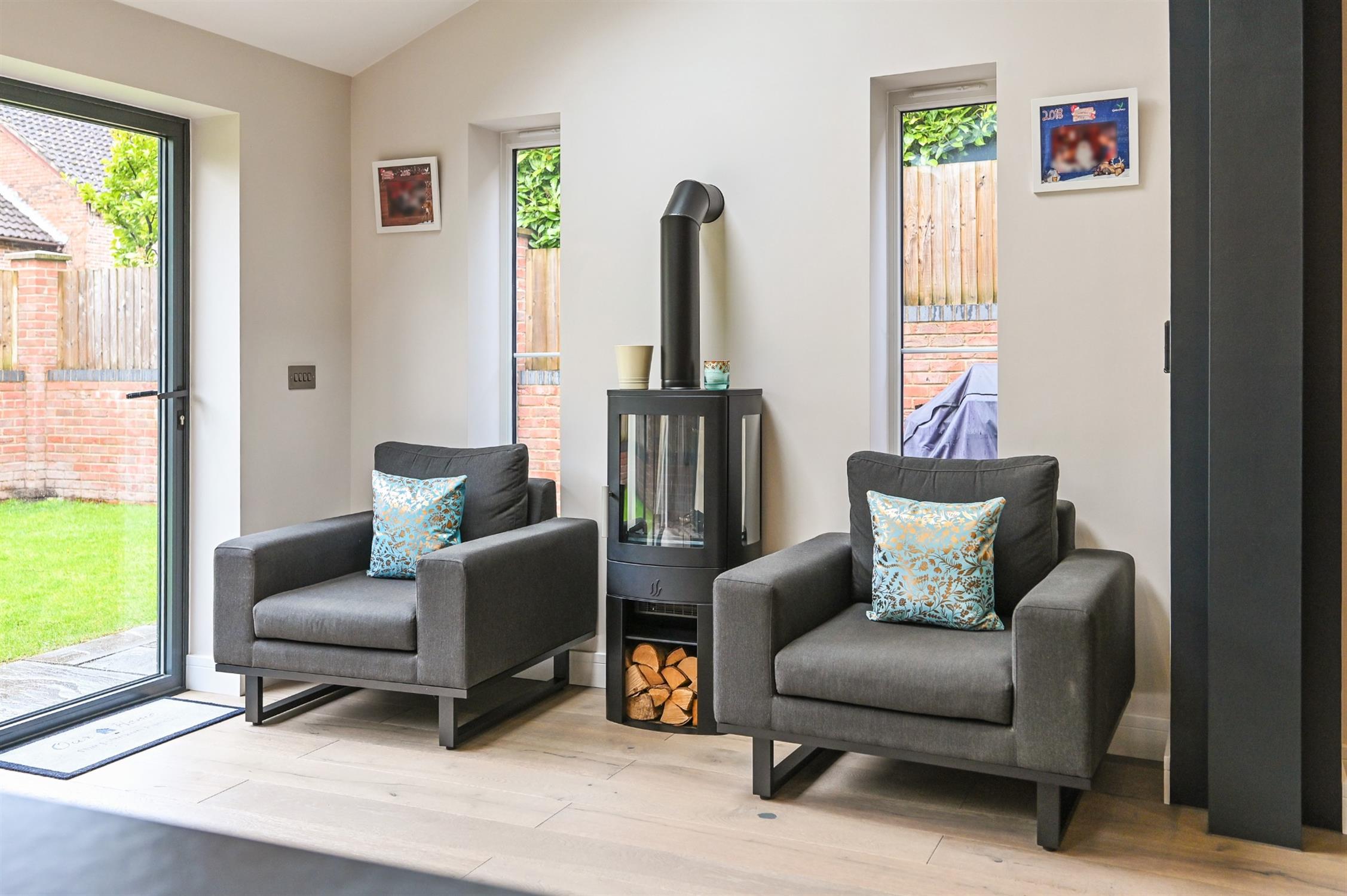 Superb, light and spacious open-plan kitchen, dining and living area with aluminium bi-fold doors opening onto the rear garden. The kitchen has been stylishly fitted and designed with an impressive island which incorporates base and drawer units. An exposed steel beam is a feature of the room. There is an electric induction hob with fitted extractor. There is an additional range of units which incorporate two integrated Neff ovens, integrated fridge and freezer, Neff microwave, warming drawer, wine cooler and dishwasher. Base, wall and drawer units are complemented by the Dekton worktops. The flooring throughout is engineered oak wood flooring. Velux windows are fitted with remote control, blinds and opening. The dining and living area flow perfectly, with electric wood burning stove and plenty of space for dining table and chairs. Inset ceiling lighting and radiators.