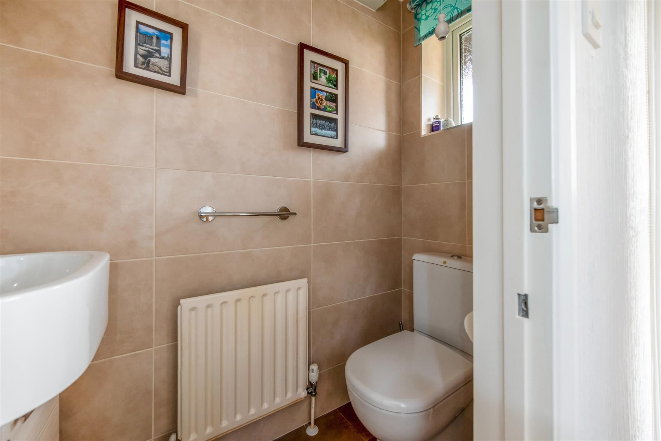 Fitted suite comprising shower cubicle. Pedestal hand wash basin with mixer tap over. WC. Heated towel rail. Tiled. Double glazed window to the front aspect.