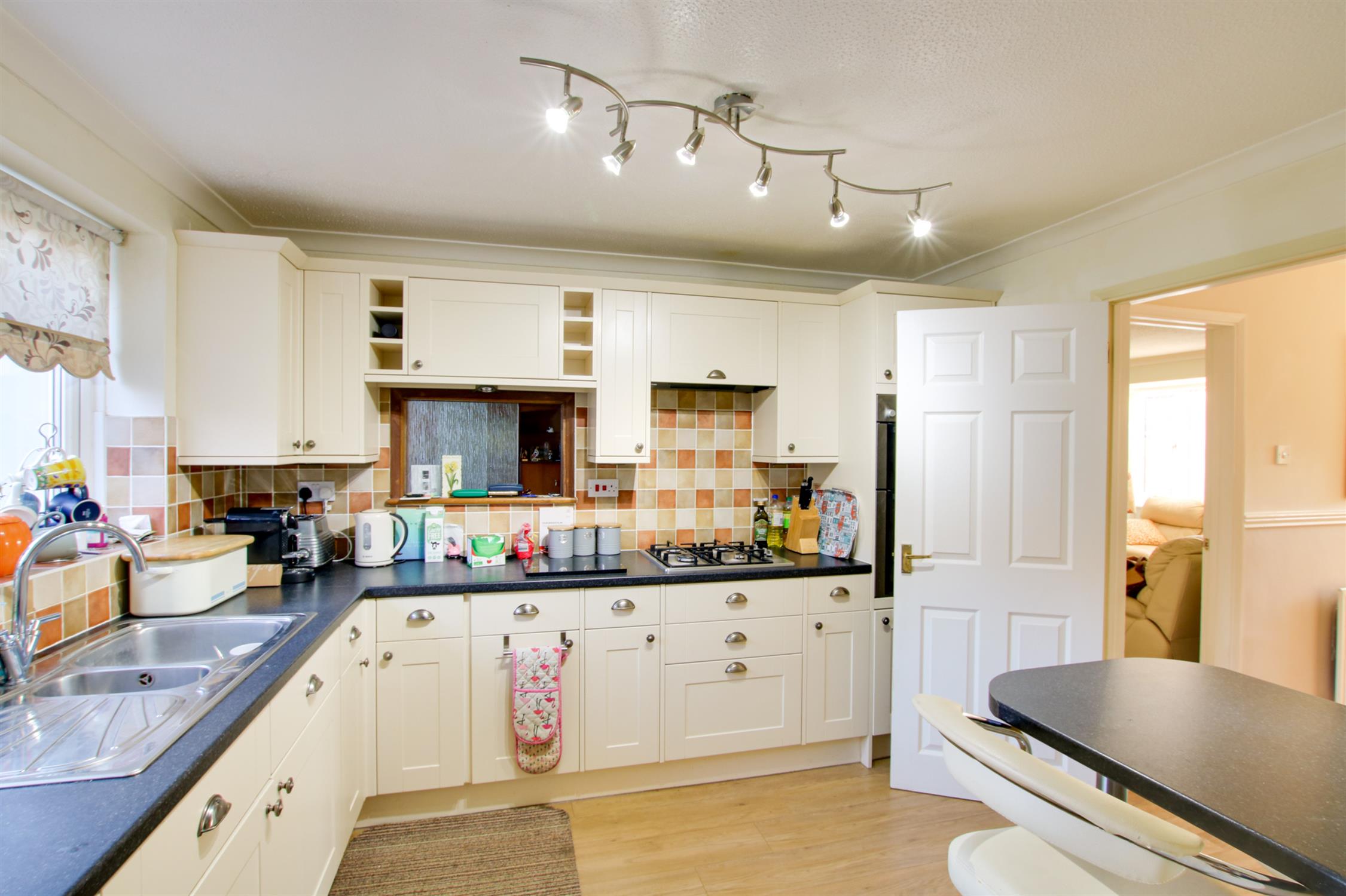 A range of fitted base cupboard, drawer and wall units with worktops. Space for a fridge/freezer. Integrated dishwasher and washing machine. Stainless steal sink with tap over. Double glazed door to rear with access to the rear garden. Internal door leading to the garage.