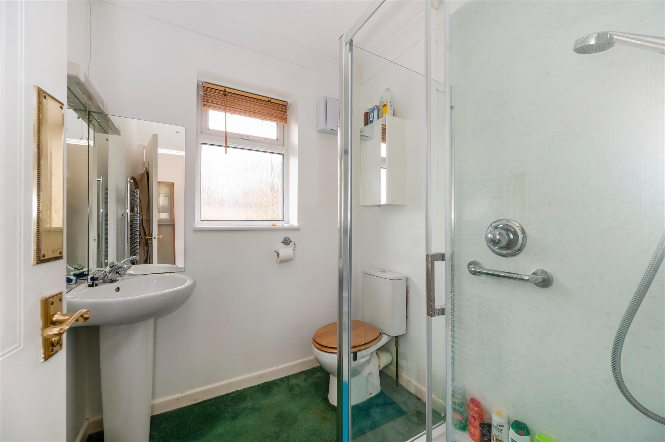 Fitted with a built in shower, pedestal wash hand basin and low level WC. Heated towel rail. Window to the side aspect.
