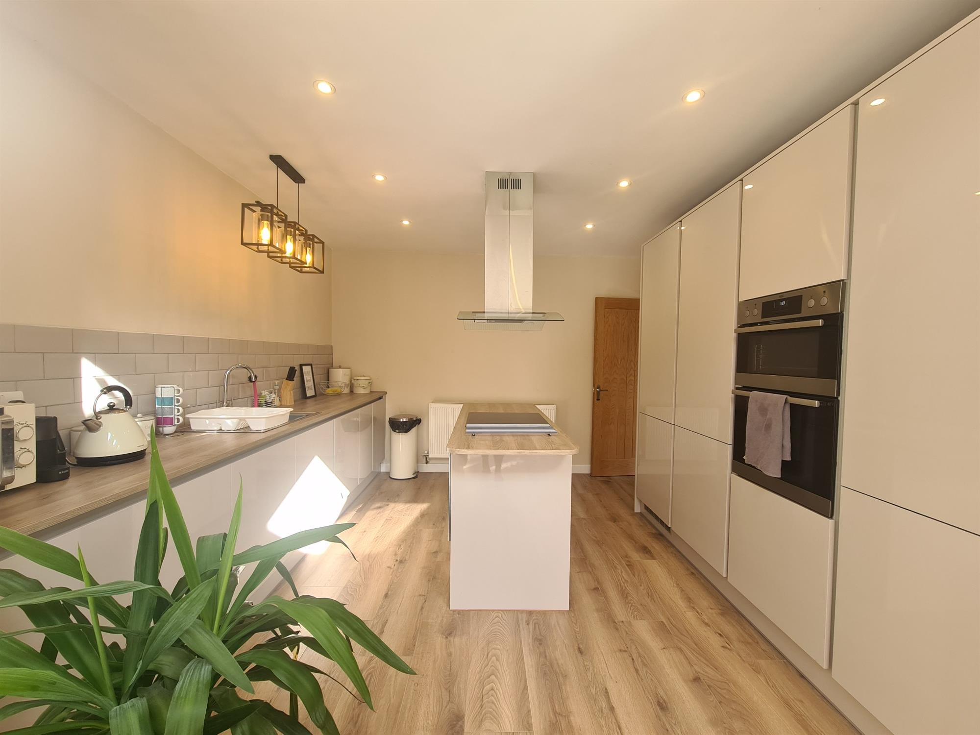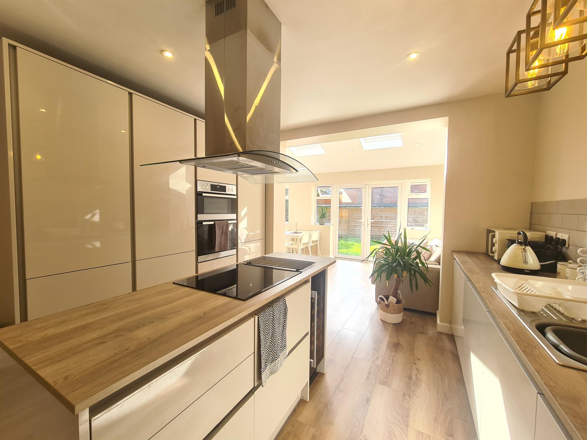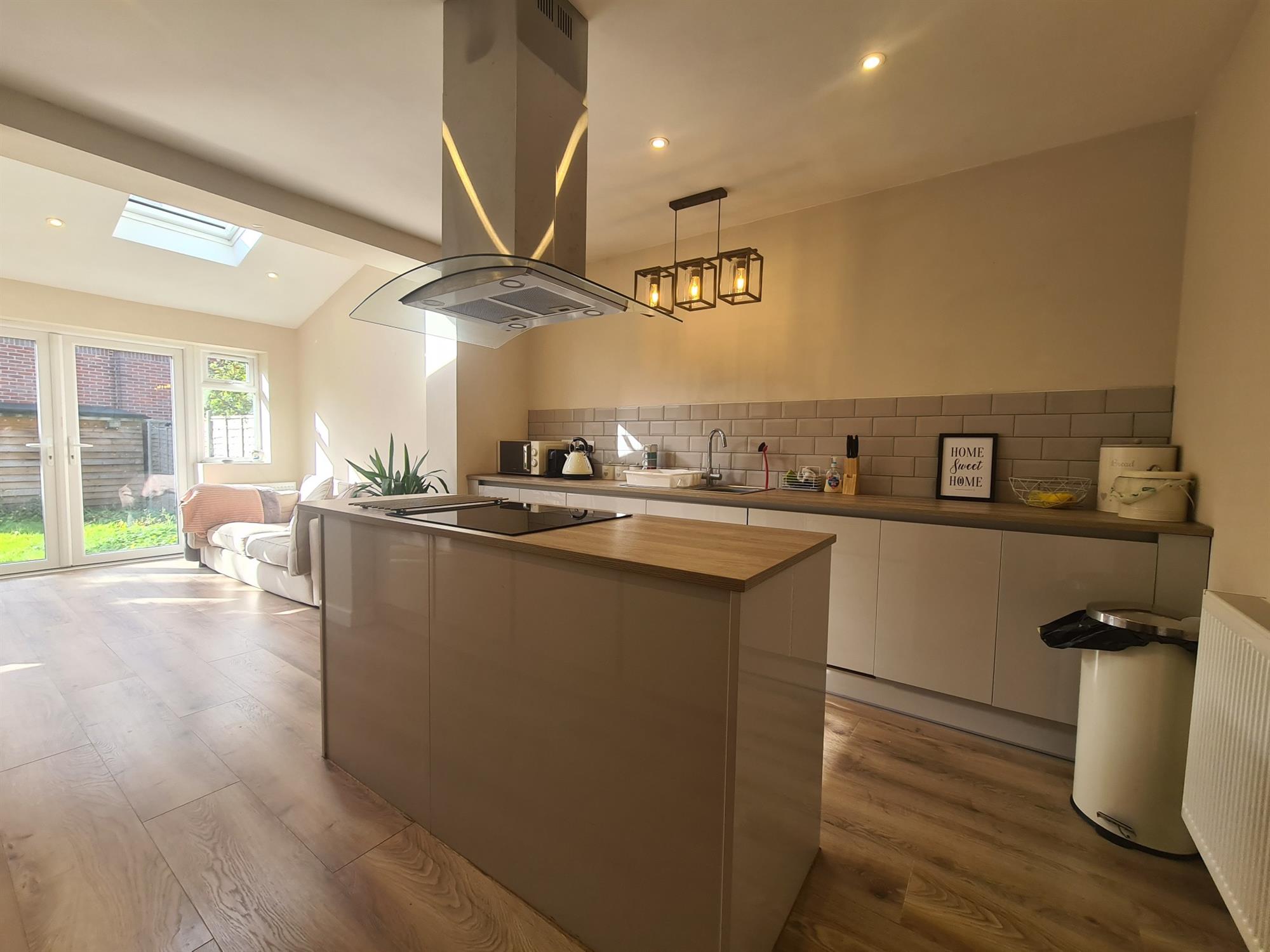 KITCHEN/ DINING ROOM - Open planned kitchen, living dining room with a beautifuil kitchen island that includes the electric hob and wine fridge. There is also a double oven, intergrated washing machine, fridge freezer and dishwasher. The kitchen leads to the living/dining area that features lovely high ceilings and sky lights.