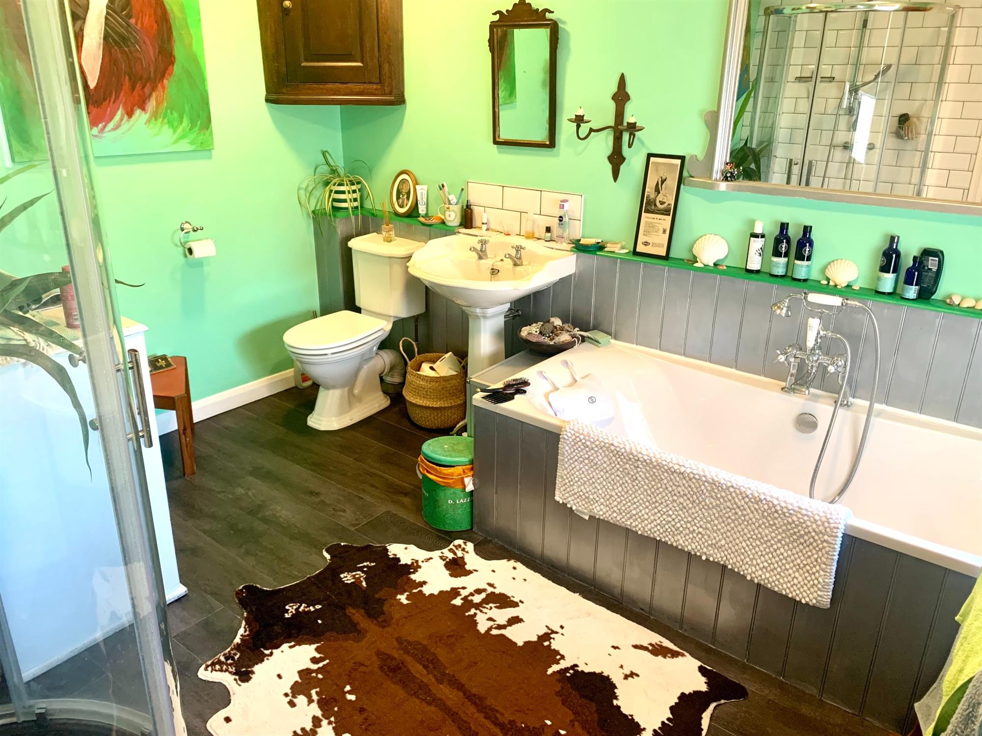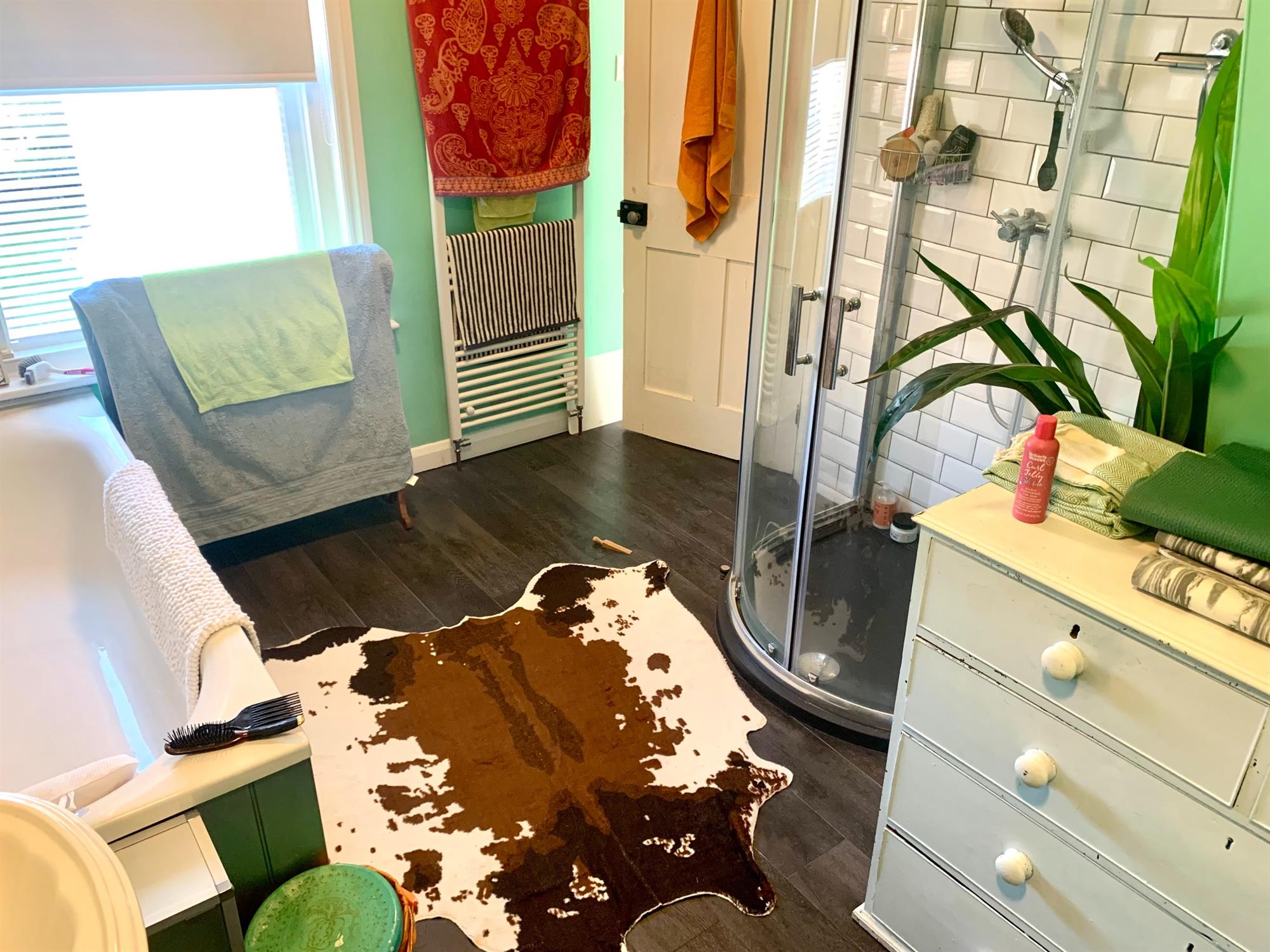 BATHROOM: Large 4 piece bathroom located to the middle first floor of the home with window to the rear. The white suite comprises basin, toilet, corner shower cubicle and bath.