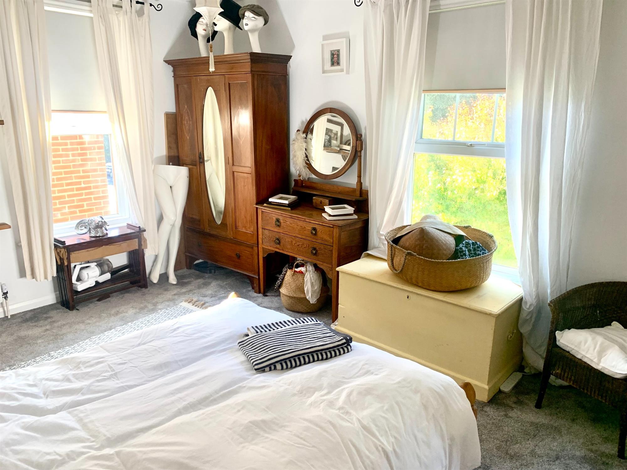 BEDROOM 1: Double carpeted bedroom located to the front of the property with dual aspect views to front overlooking the Park and side. Furniture consists of: Double bed, wardrobe, side units and drawers.