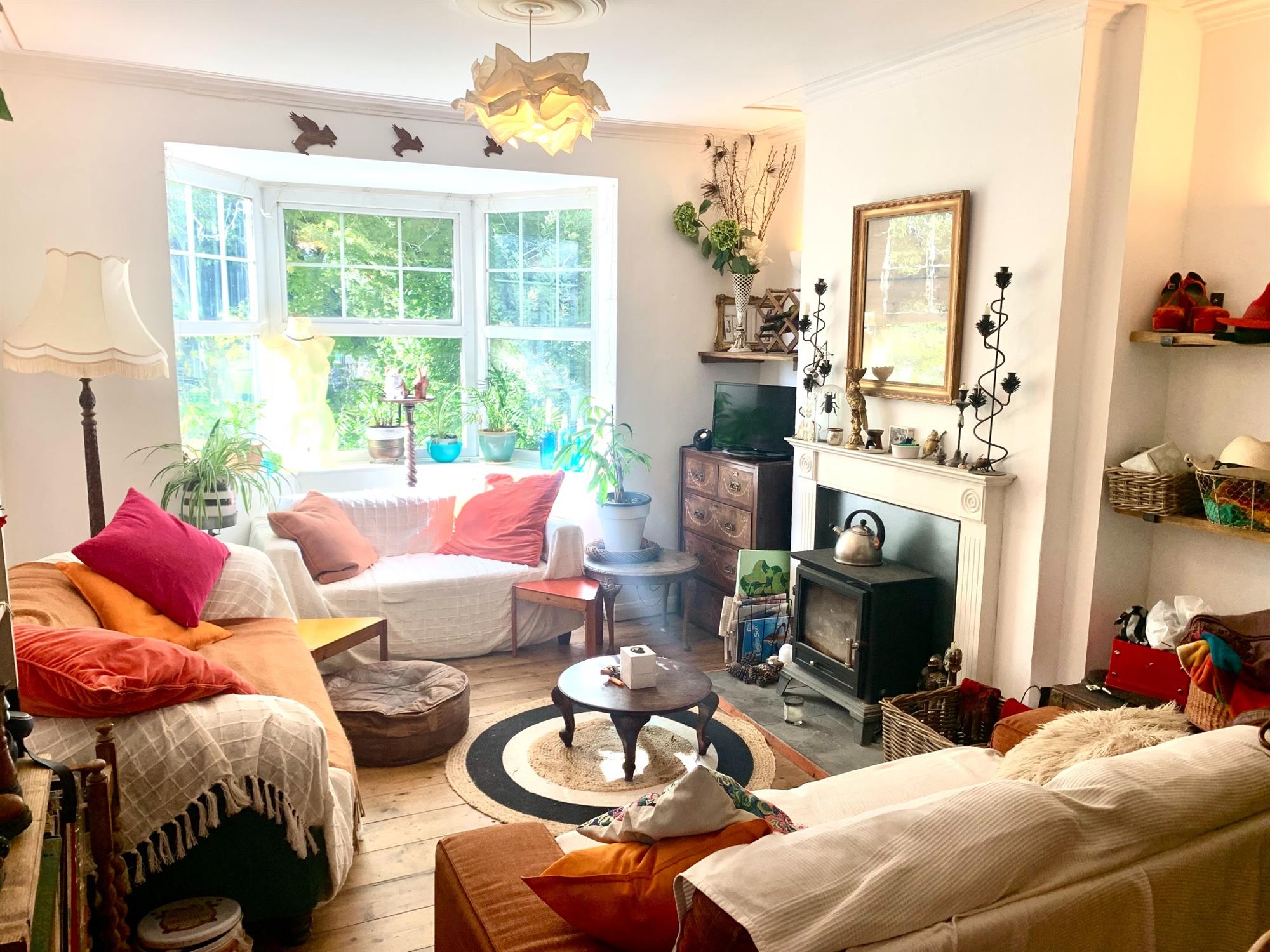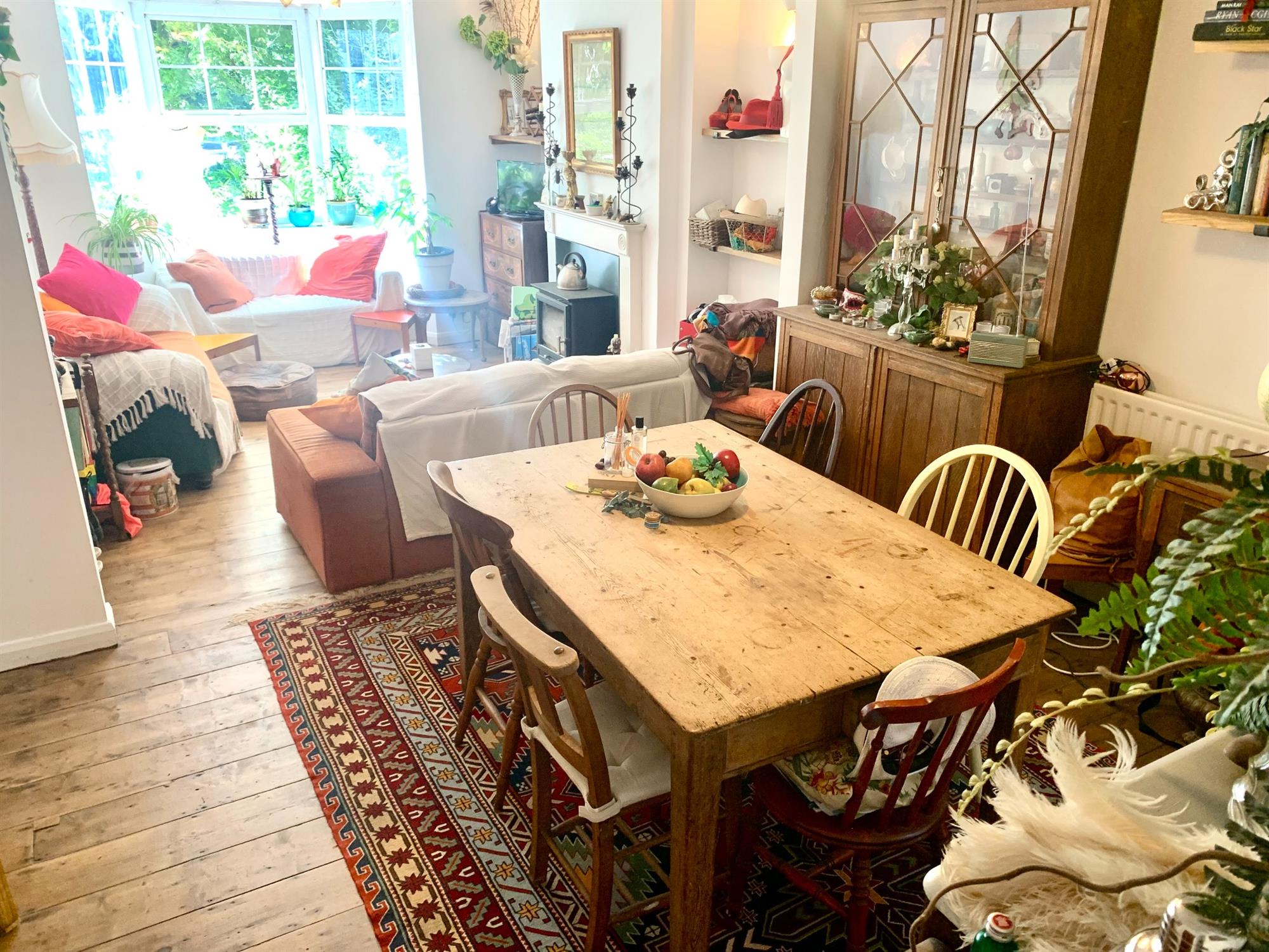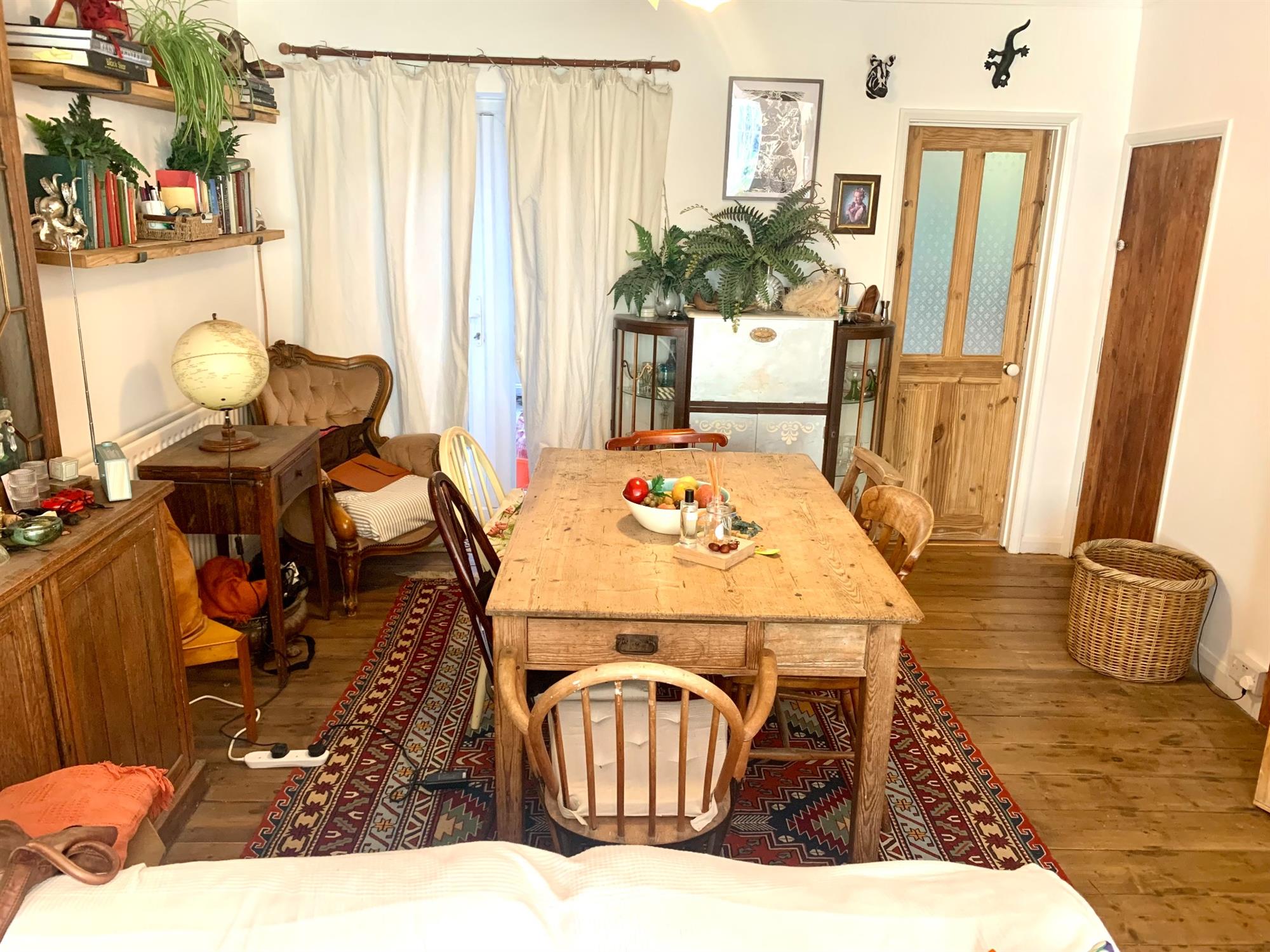 LOUNGE/DINER – Lounge has large window overlooking Riverside Park with log burner set in mantlepiece. The dining area has handy cupboard under stairs and doors to the kitchen and to lean to. The wood flooring continues from hallway. Furniture consist of: table and chairs, 2 x sofas, drinks cabinet and side tables.