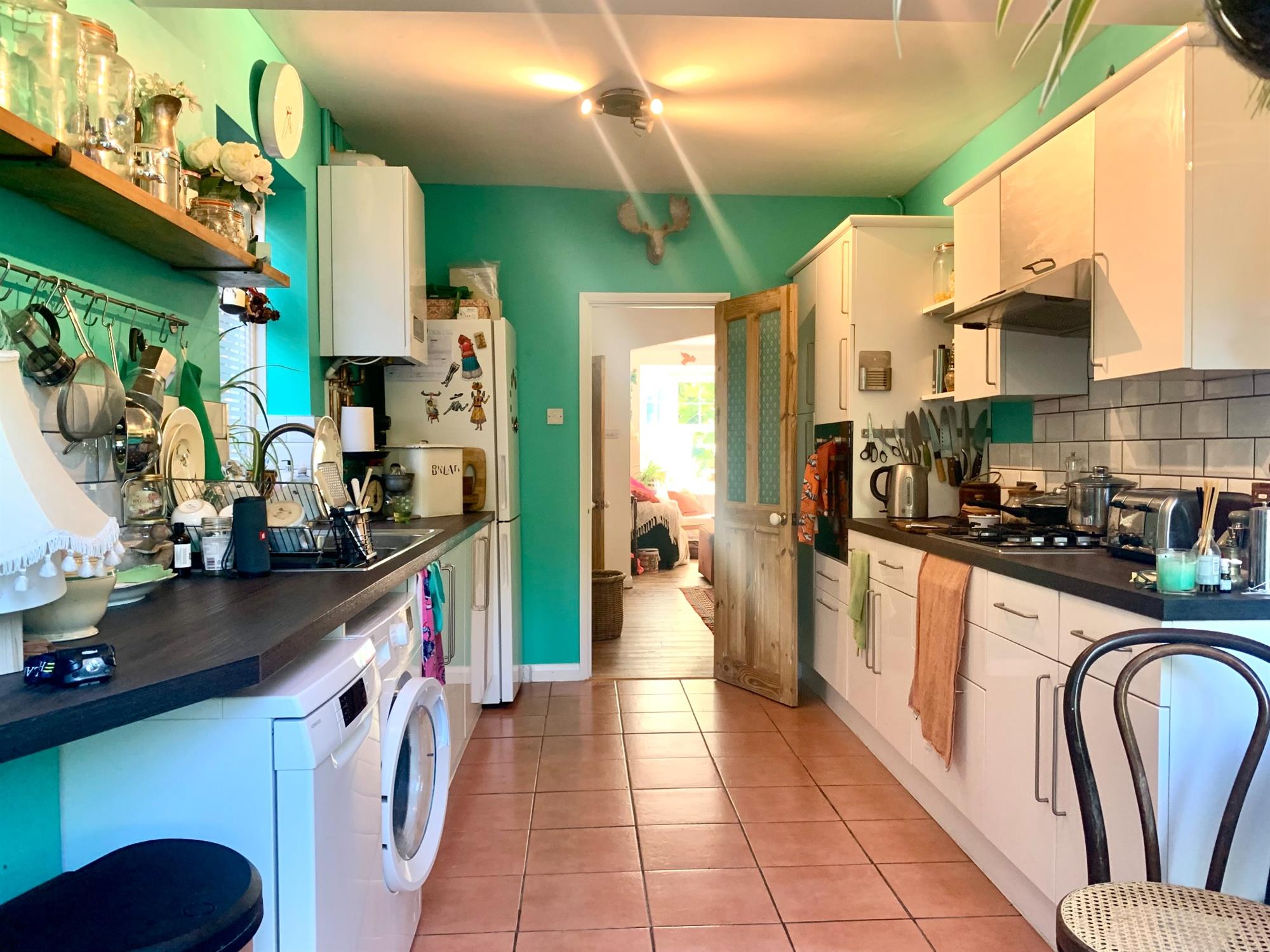 KITCHEN: Fitted wall and base units with appliances consisting of dishwasher, washing machine, fridge freezer, gas hob and electric oven. Tiled flooring with window to side and French doors to garden. Furniture includes small table and chairs.