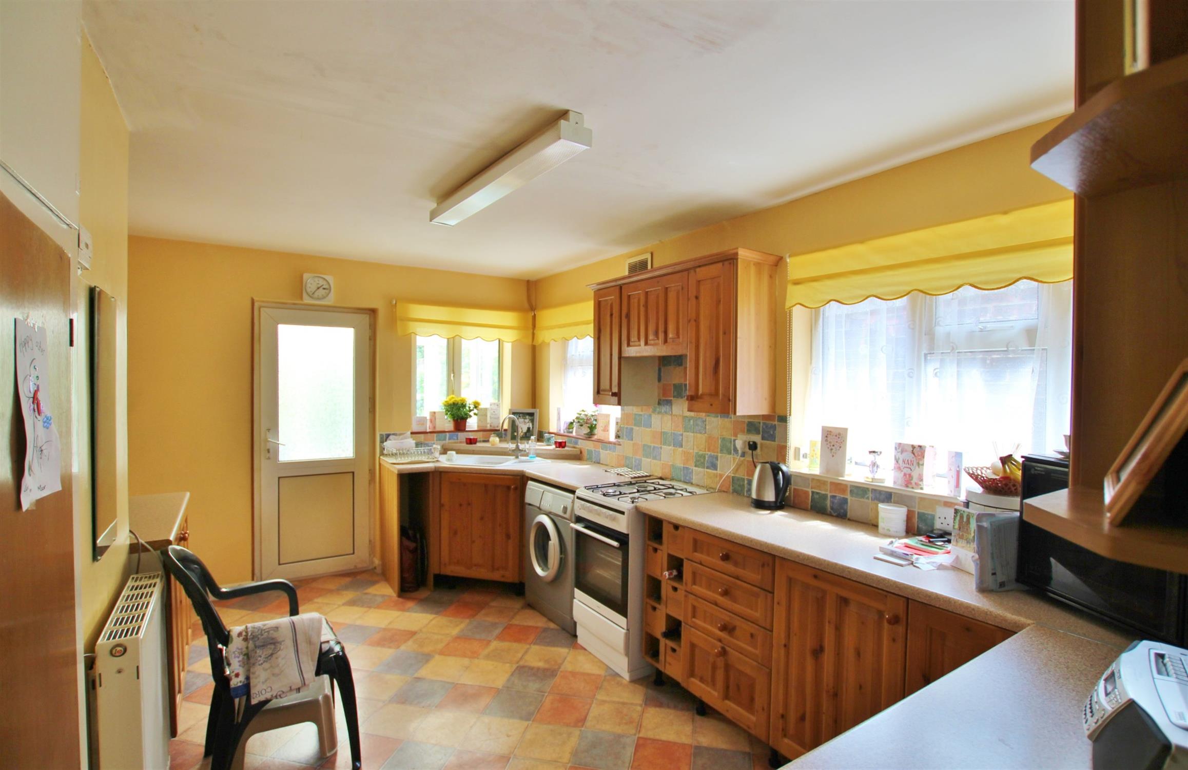 Comprehensive range of eye and base level units to include a corner positioned one and a half bowl single drainer stainless steel sink unit with mixer tap fitting. Dual aspect with double glazed windows to side elevation, double glazed window and obscure double glazed door to rear elevations. Suitable space and plumbing for washing machine and space for gas cooker. Fitted extractor hood. Tiled splashbacks. Radiator. Built-in double width cupboard housing hot water tank. Smooth plastered ceiling. Fluorescent strip lighting.