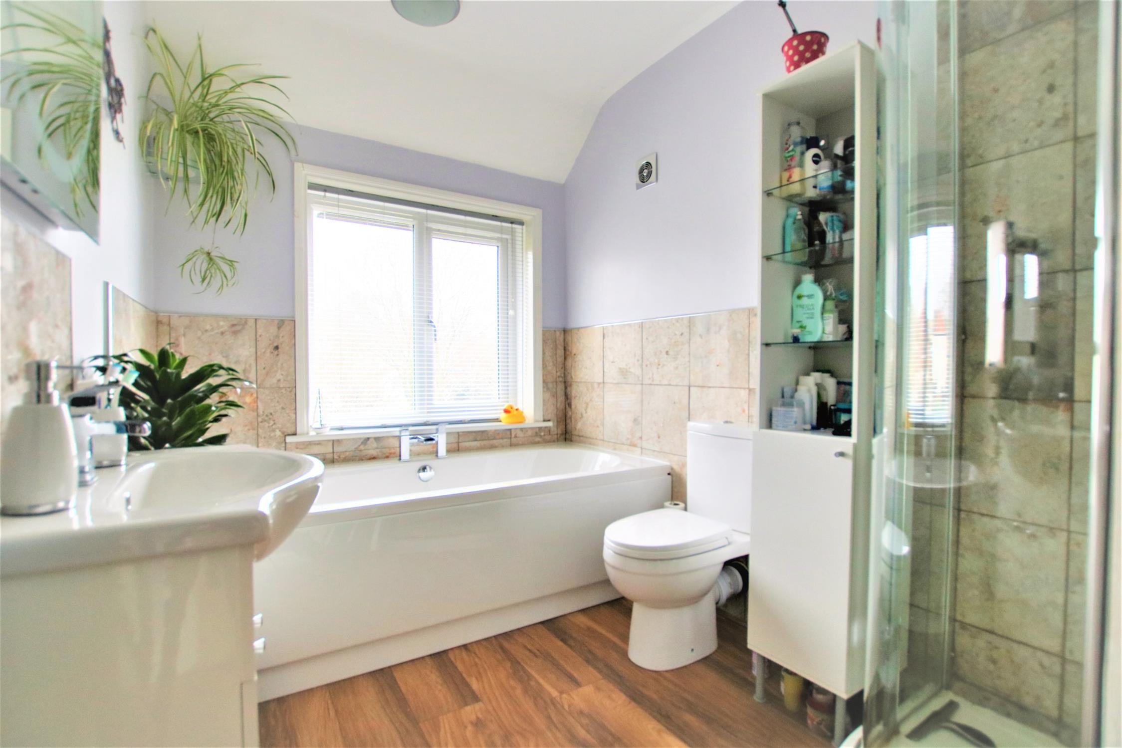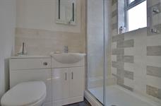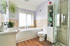 Wooden effect laminate flooring, double glazed windows to rear aspect, P shaped shower with valve bar shower unit within, full size bath with centre mixer taps, natural stone wall tiling, low level w/c, ceramic sink unit, heated towel rail.