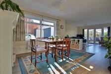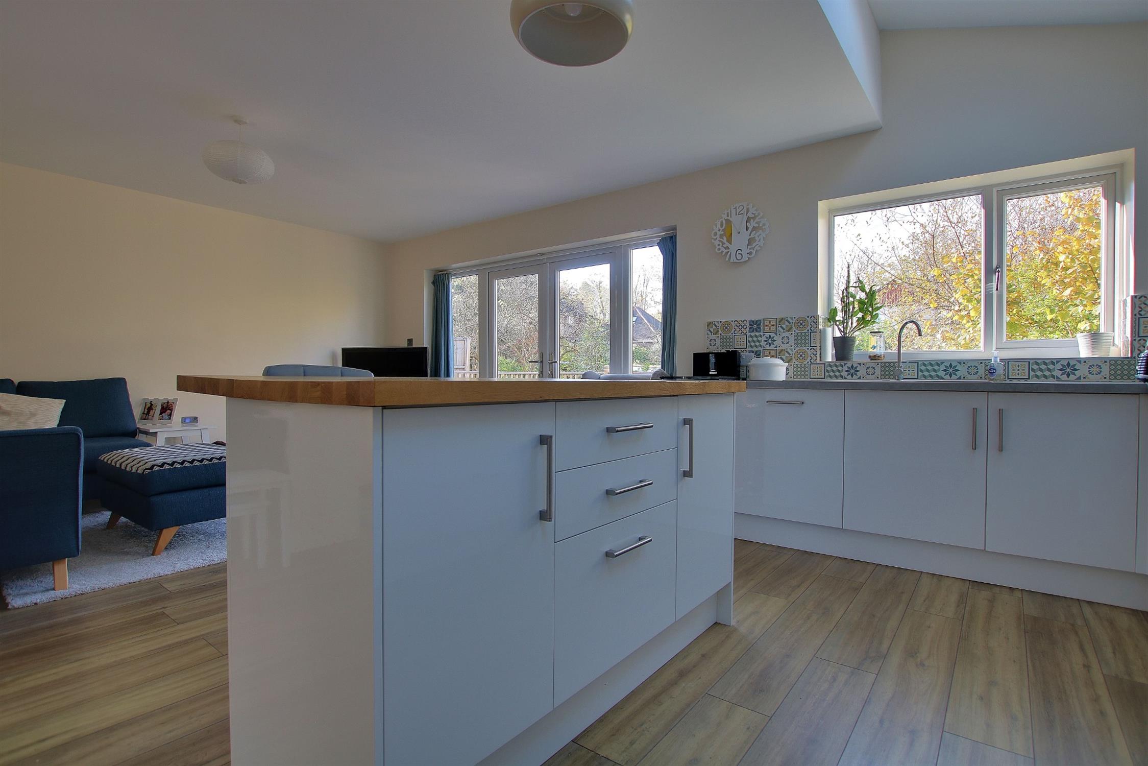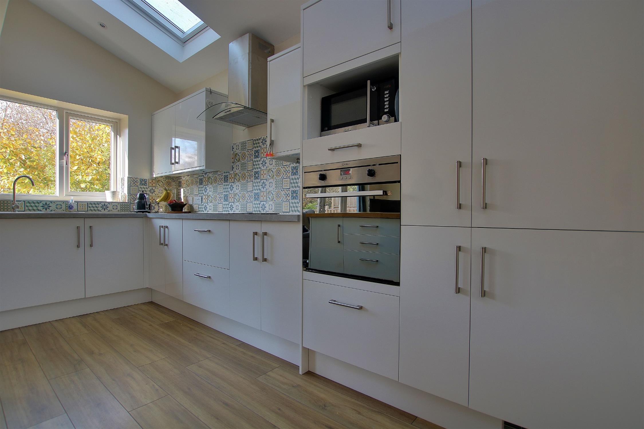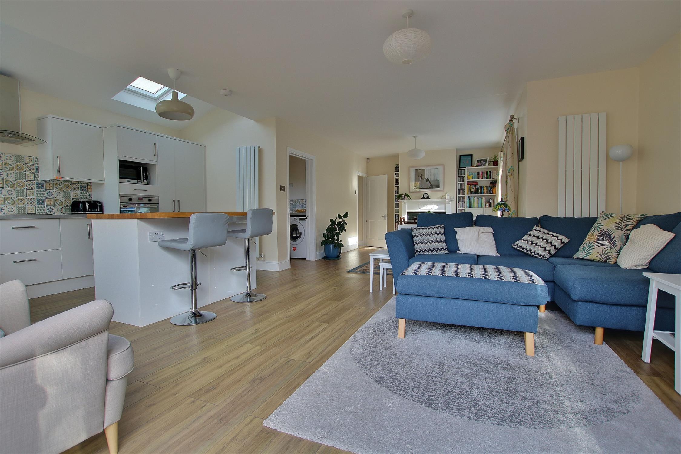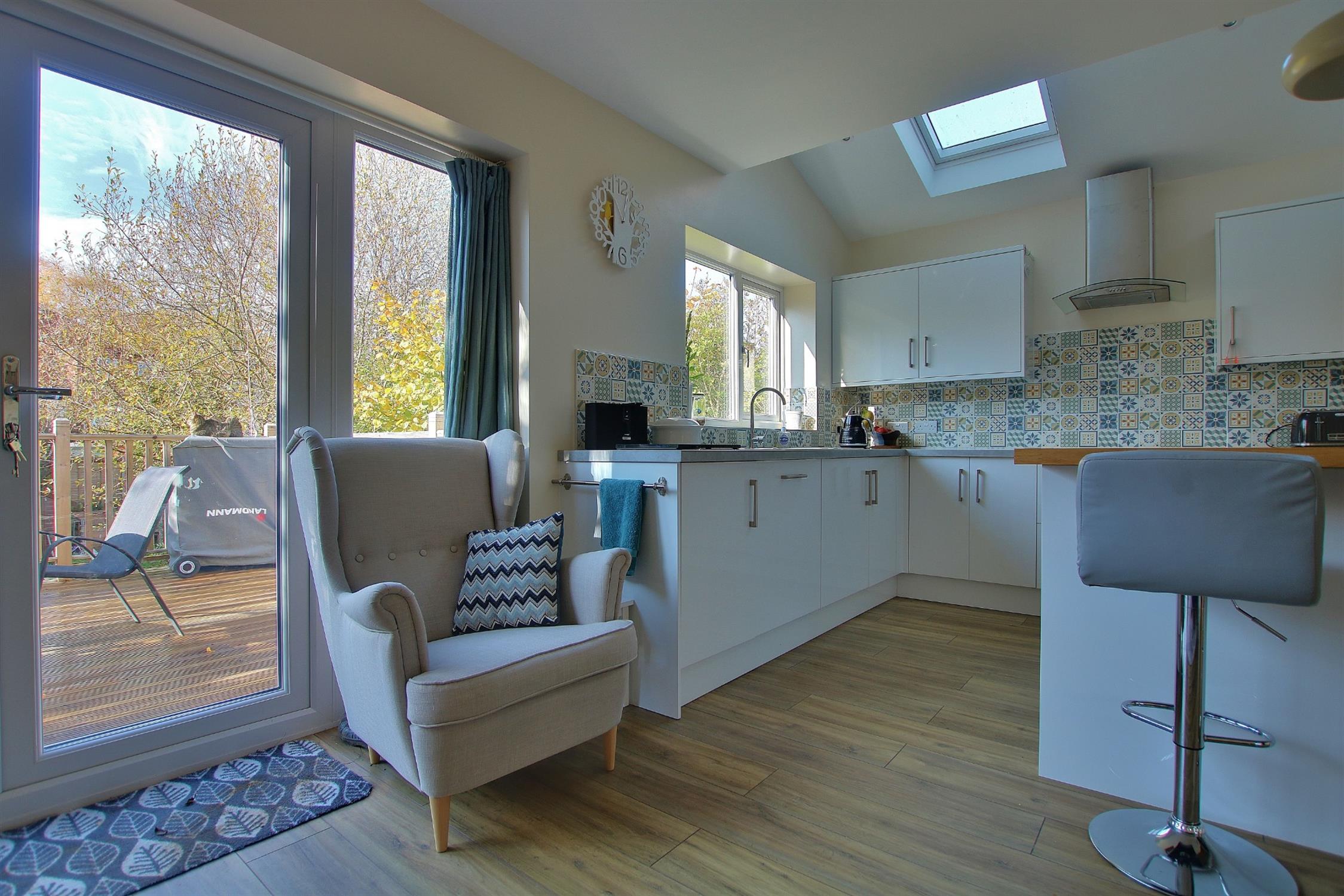 Modern fitted Howdens white glossy units with Indesit integrated appliances including a dishwasher, tall standing fridge/freezer, electric oven, ceramic hob and extractor fan over, dual aspect double glazed windows to the side and rear aspect with double glazed French doors leading to the rear garden, wooden effect laminate flooring, door leading to utility room, aluminium sink/drainer, tiled splash back, feature fireplace, radiators, multiple electrical sockets, smooth walls and ceiling.
