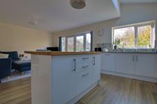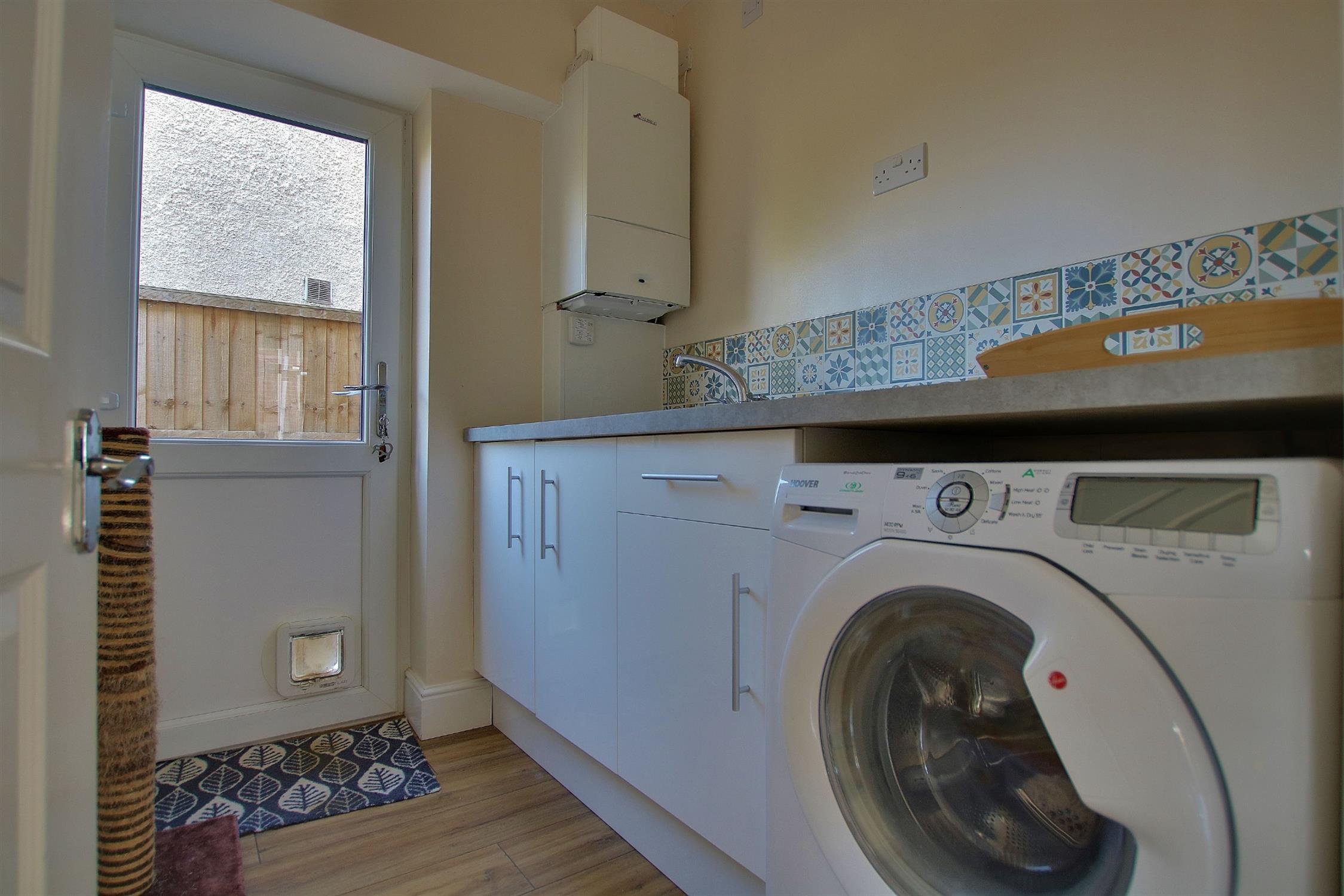 Wooden effect laminate flooring, white glossy base units, space for washing machine, Worcester Combination boiler, aluminium sink/drainer, double glazed door to side aspect, tiled splash back, smooth walls and ceiling.
