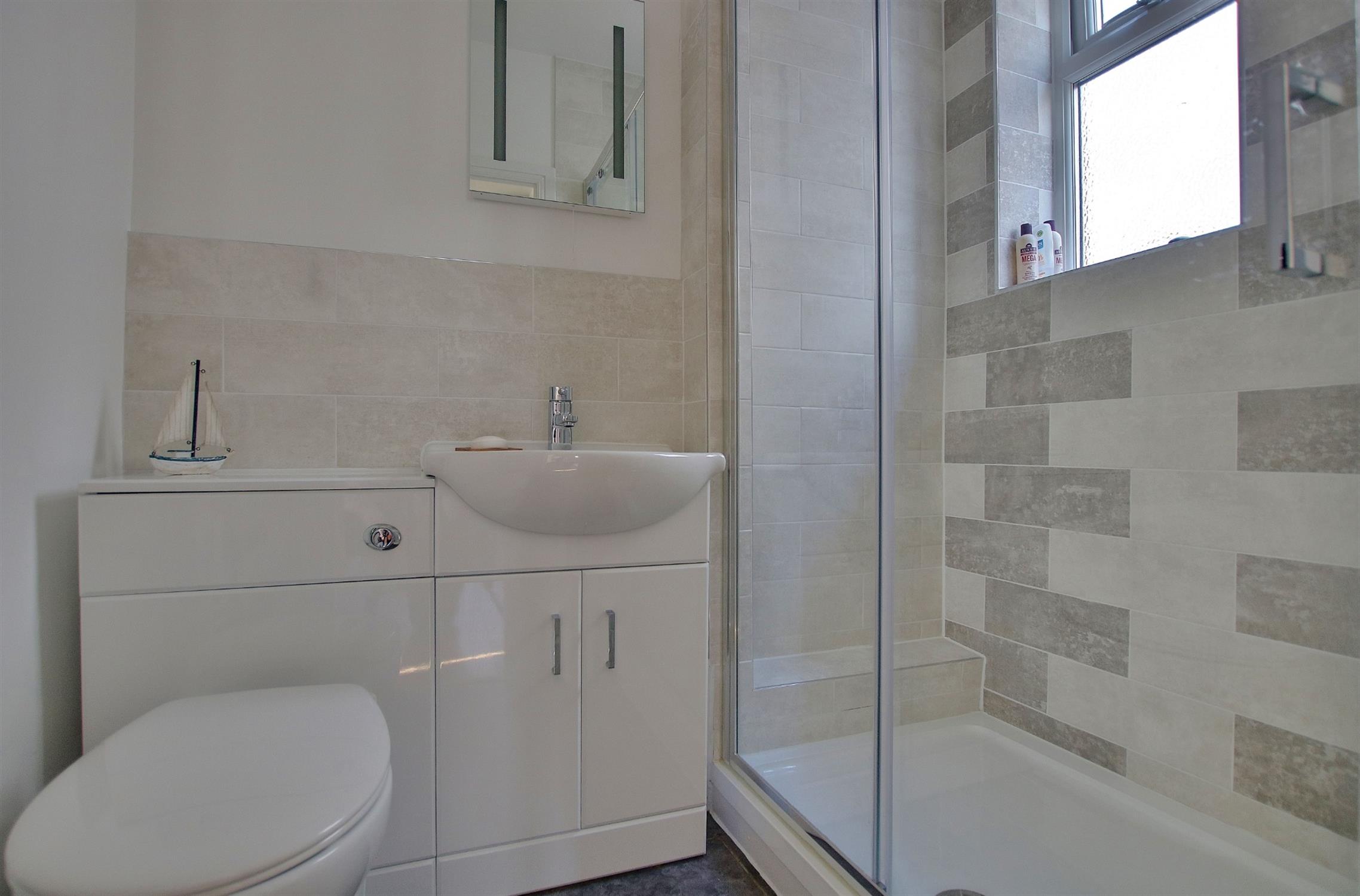 Contrasting wall and floor tiling, low level w/c and ceramic sink built into a white gloss unit, walk in shower with glass sliding door and bar valve shower unit within, obscured double glazed windows to side aspect, smooth ceiling, heated towel rail.