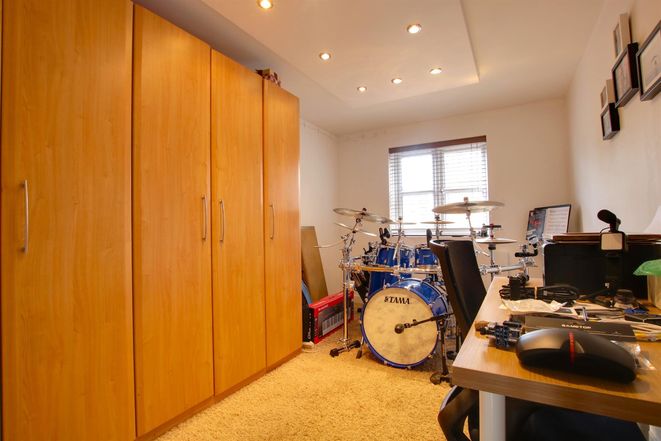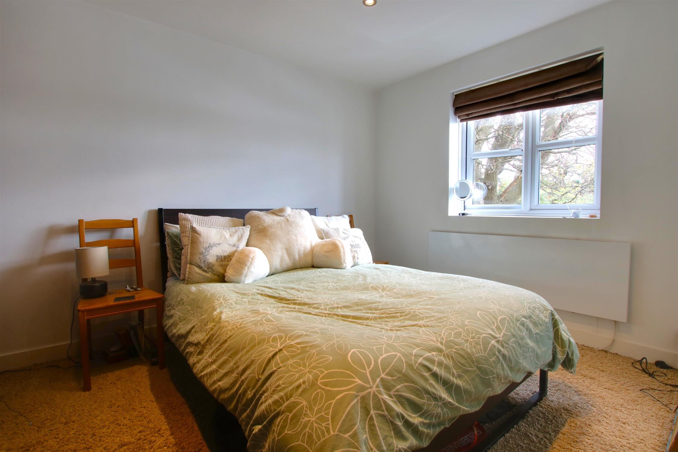 Carpeted. Inset spotlights. Double-glazed window. Electric radiator.