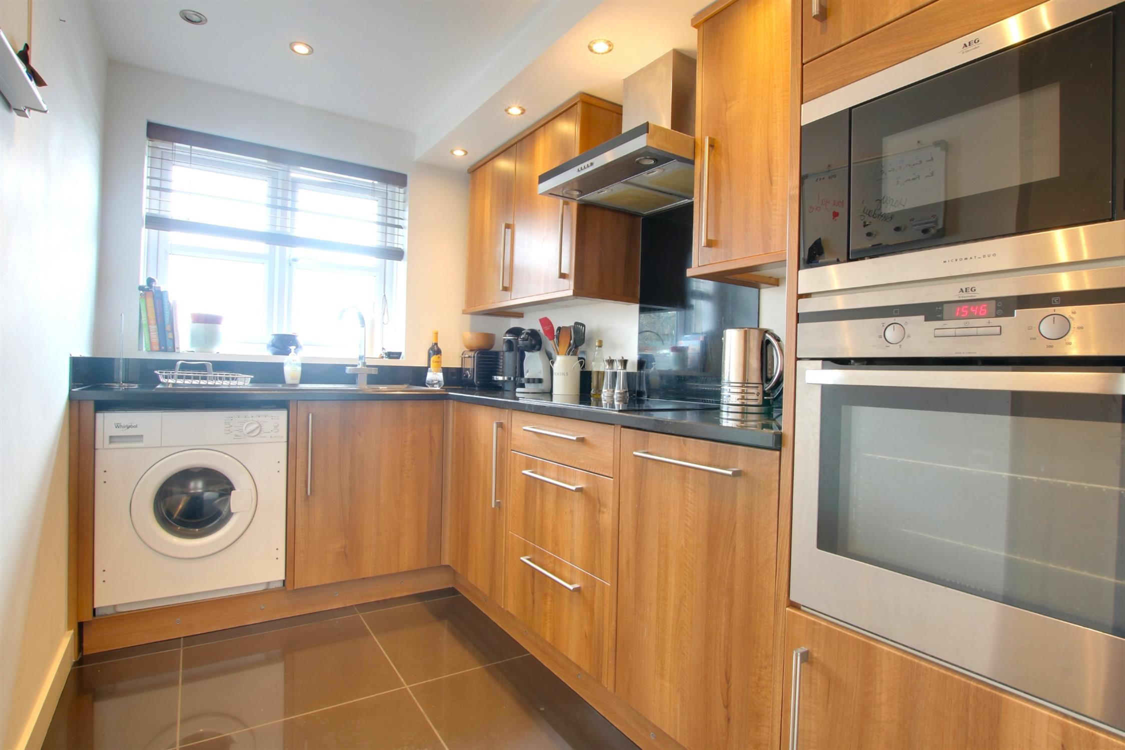 Tiled flooring. Inset spotlights. Matching wall and base units. Integrated electric oven, hob with extractor, Microwave, fridge-freezer and washing machine. Inset stainless steel sink. Double-glazed window.