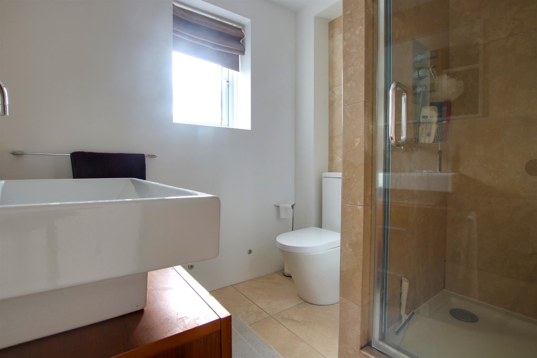 Tiled flooring. Partially tiled walls. Shower cubicle. Low level W.C and basin. Double-glazed window.