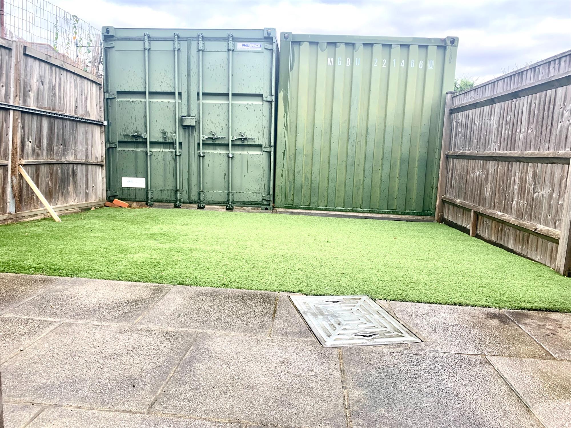 GARDEN – Patio area with artifical grass. Storage container for tenants use for storage.