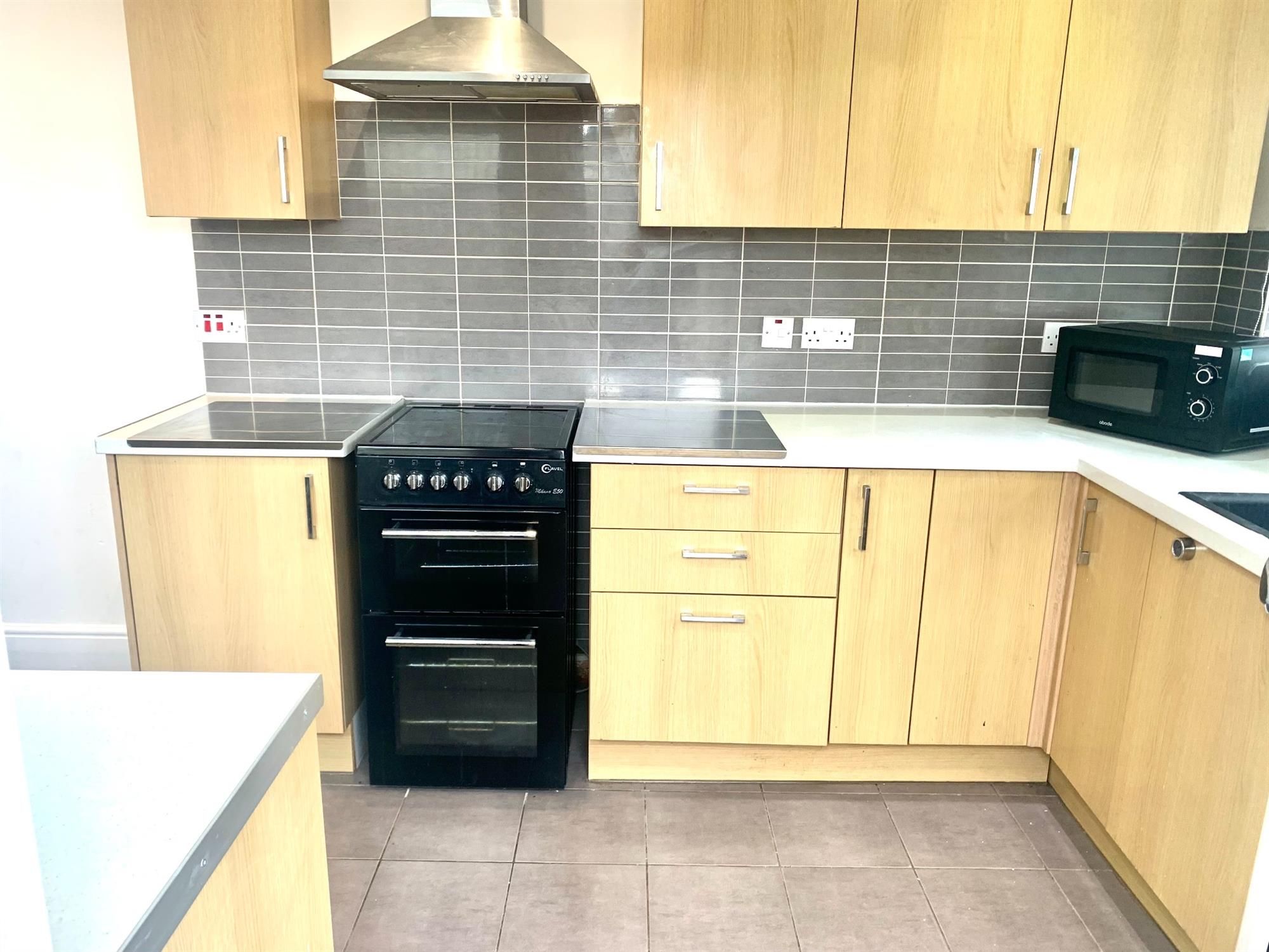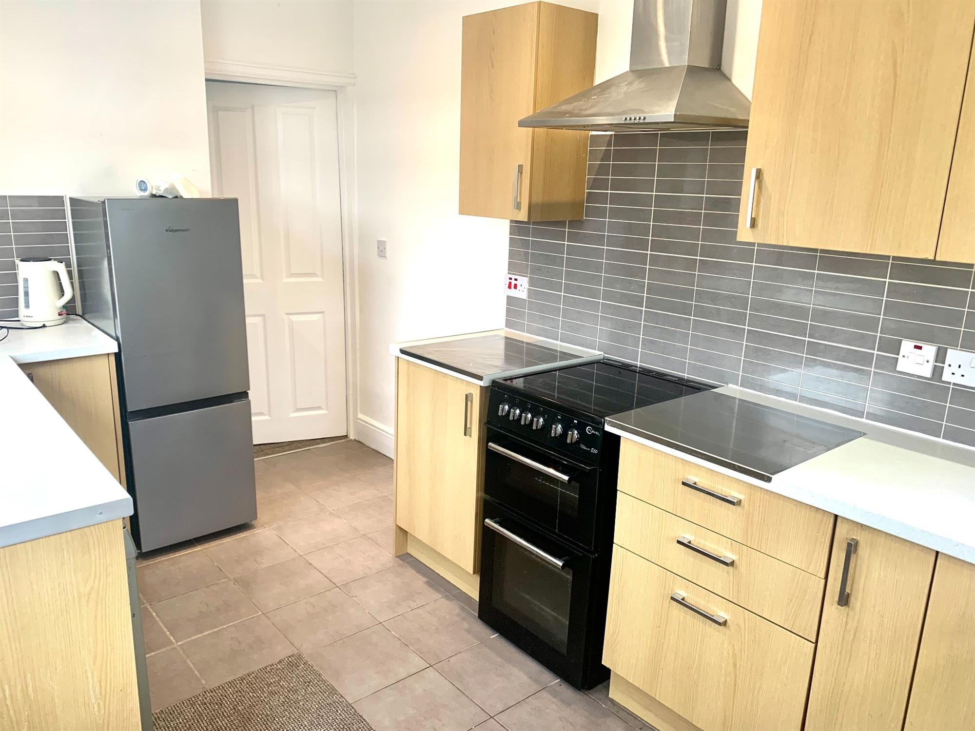 KITCHEN – Various wall and base units. Windows to rear and side and door to back parking area. Kitchen appliances consist of washing machine, slimline dishwasher, fridge/freezer and electric oven.